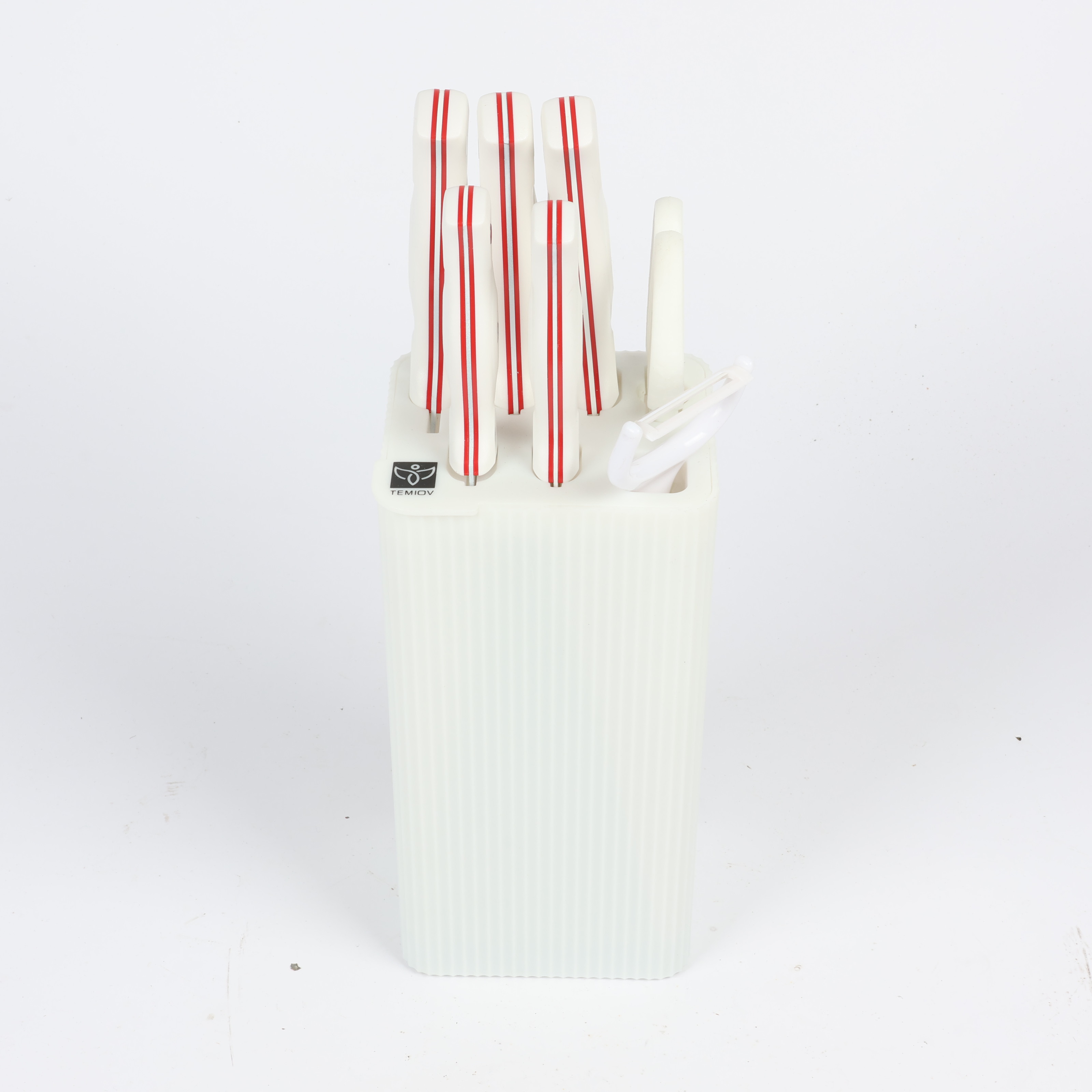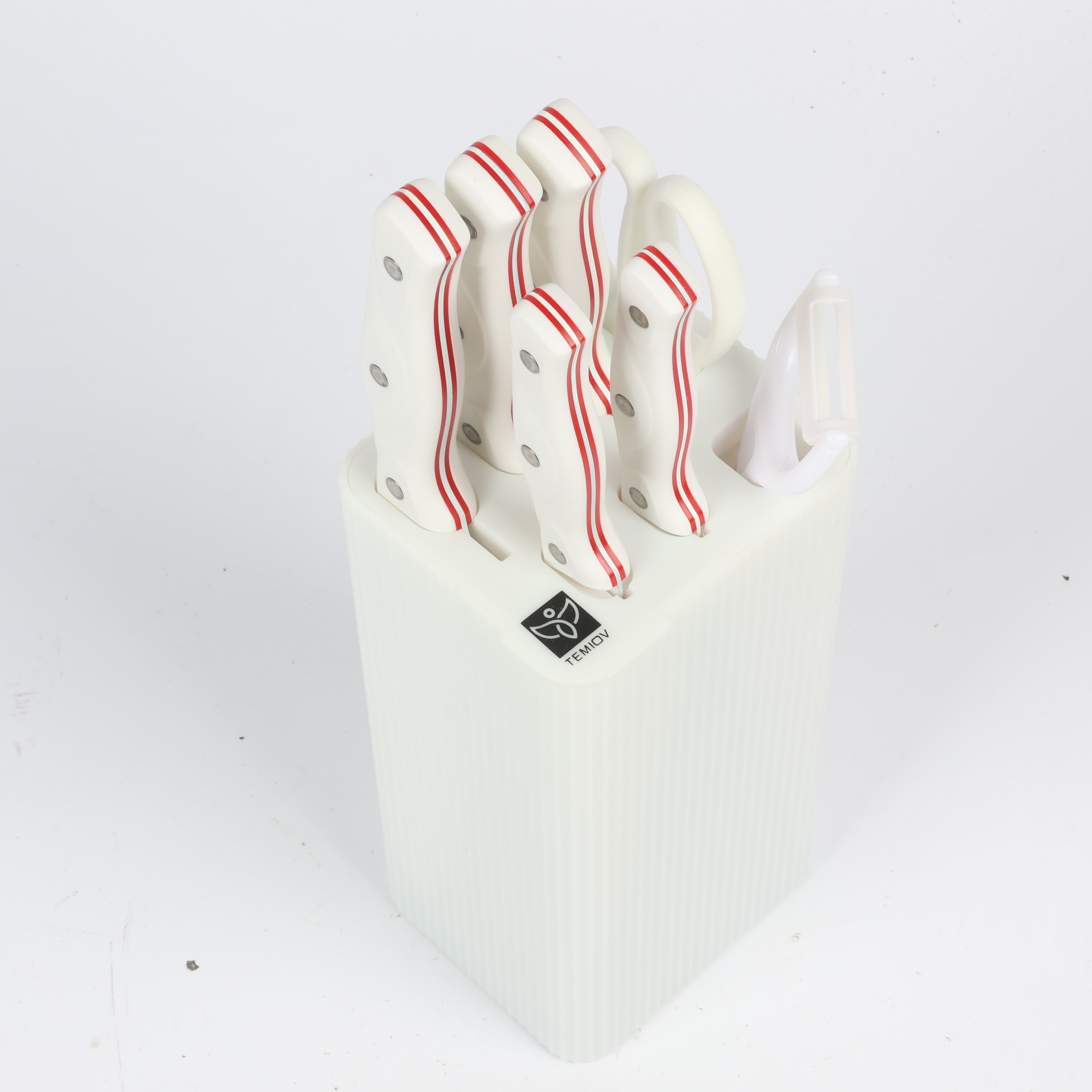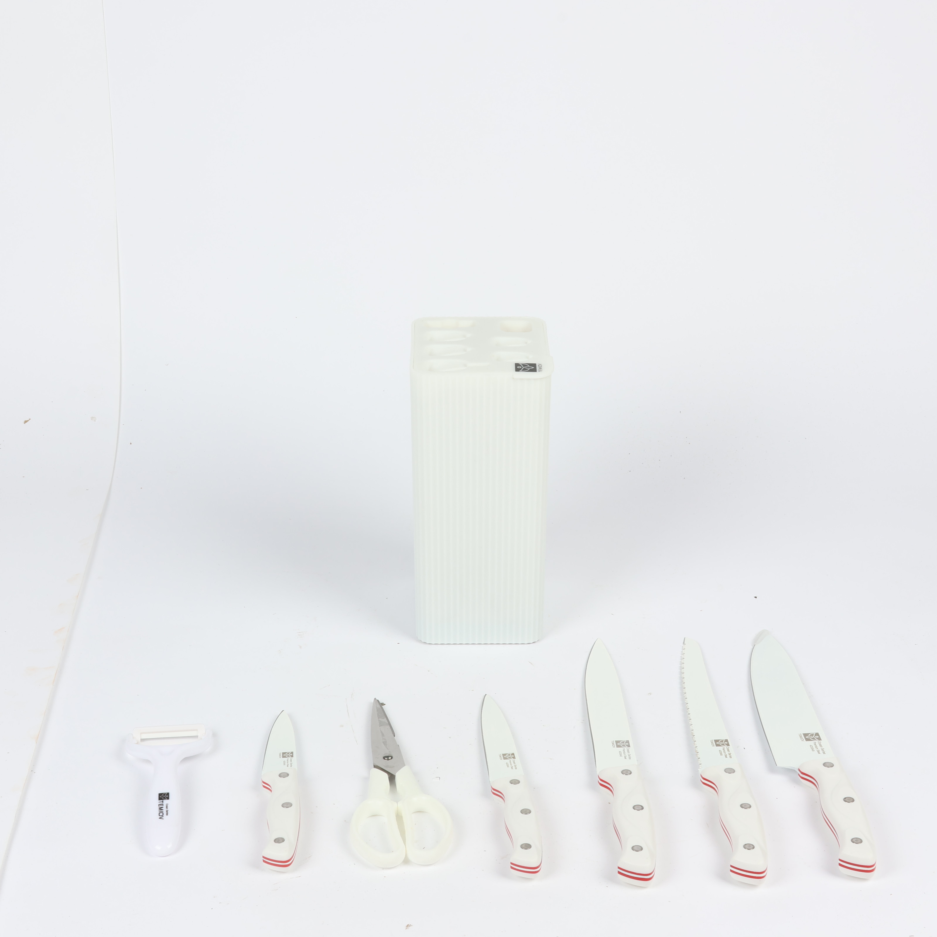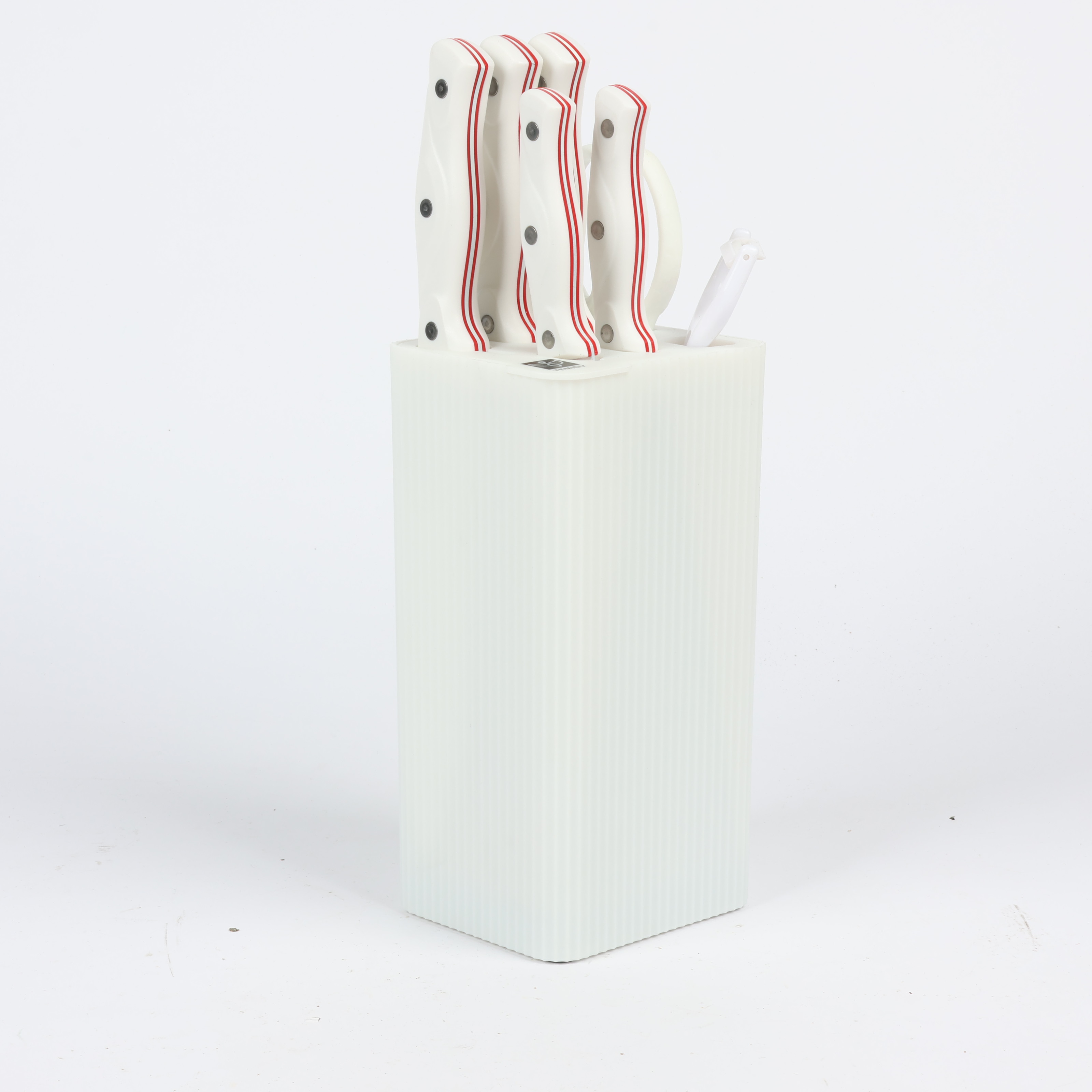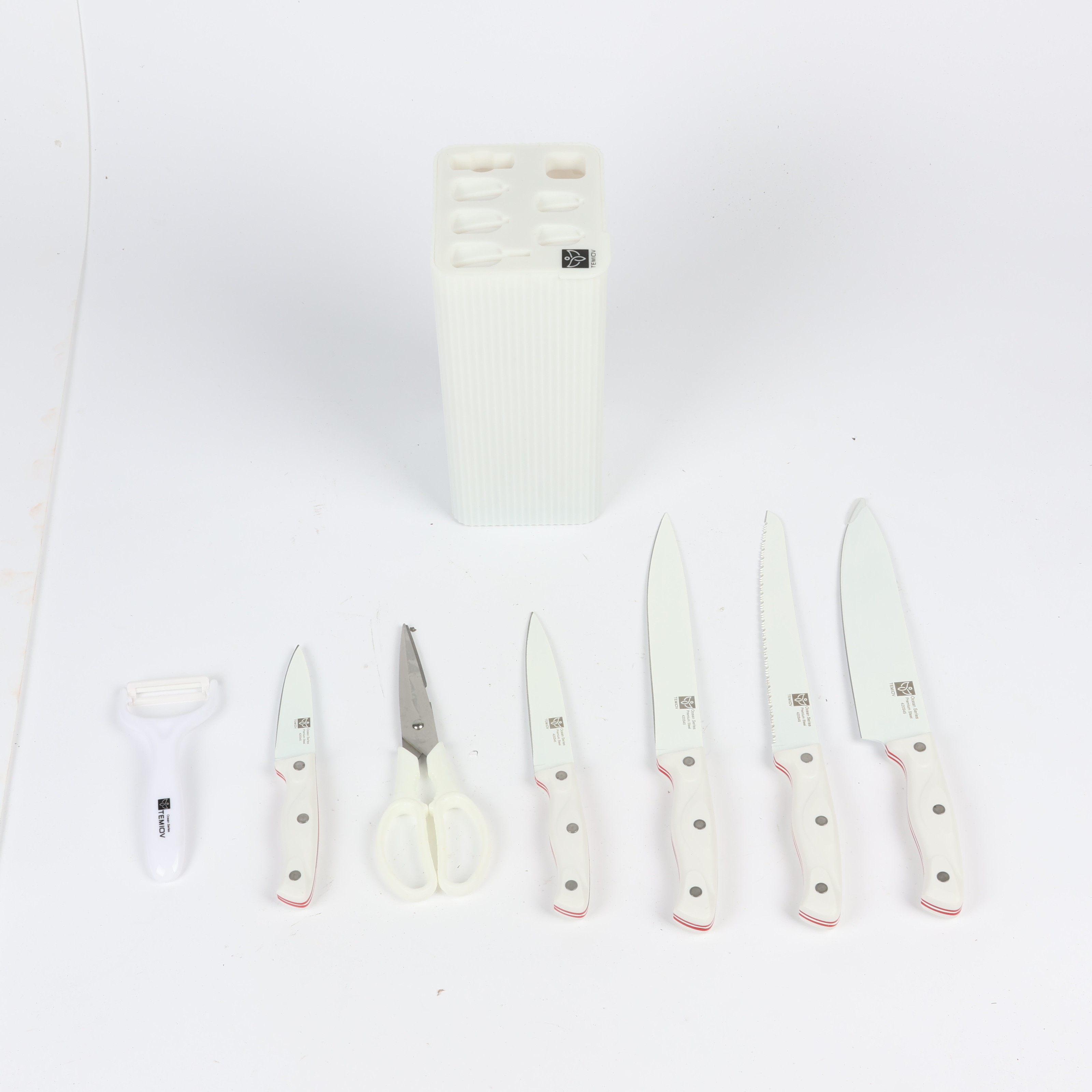 Knife Set 6-Piece with Stand: 7-inch Kitchen Knife, 8-inch Chef Knife, 8-inch Bread Knife, 5-inch Utility Knife, Kitchen Scissors, and Peeler , COLOR WHITE IN RED