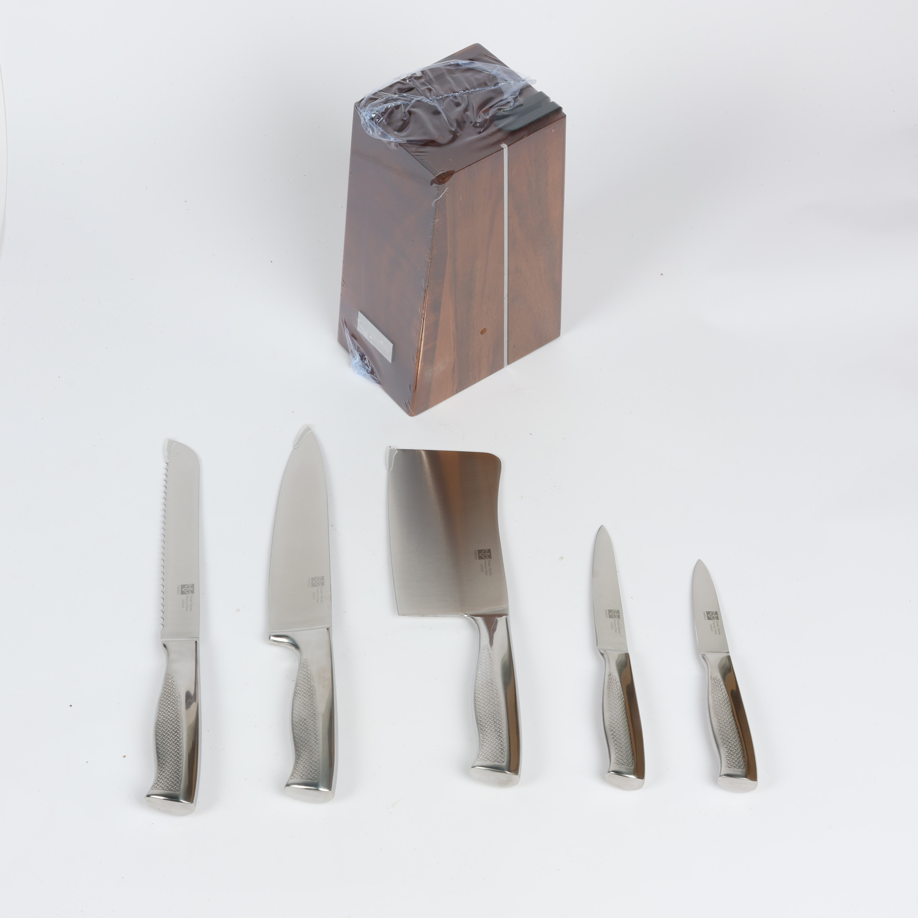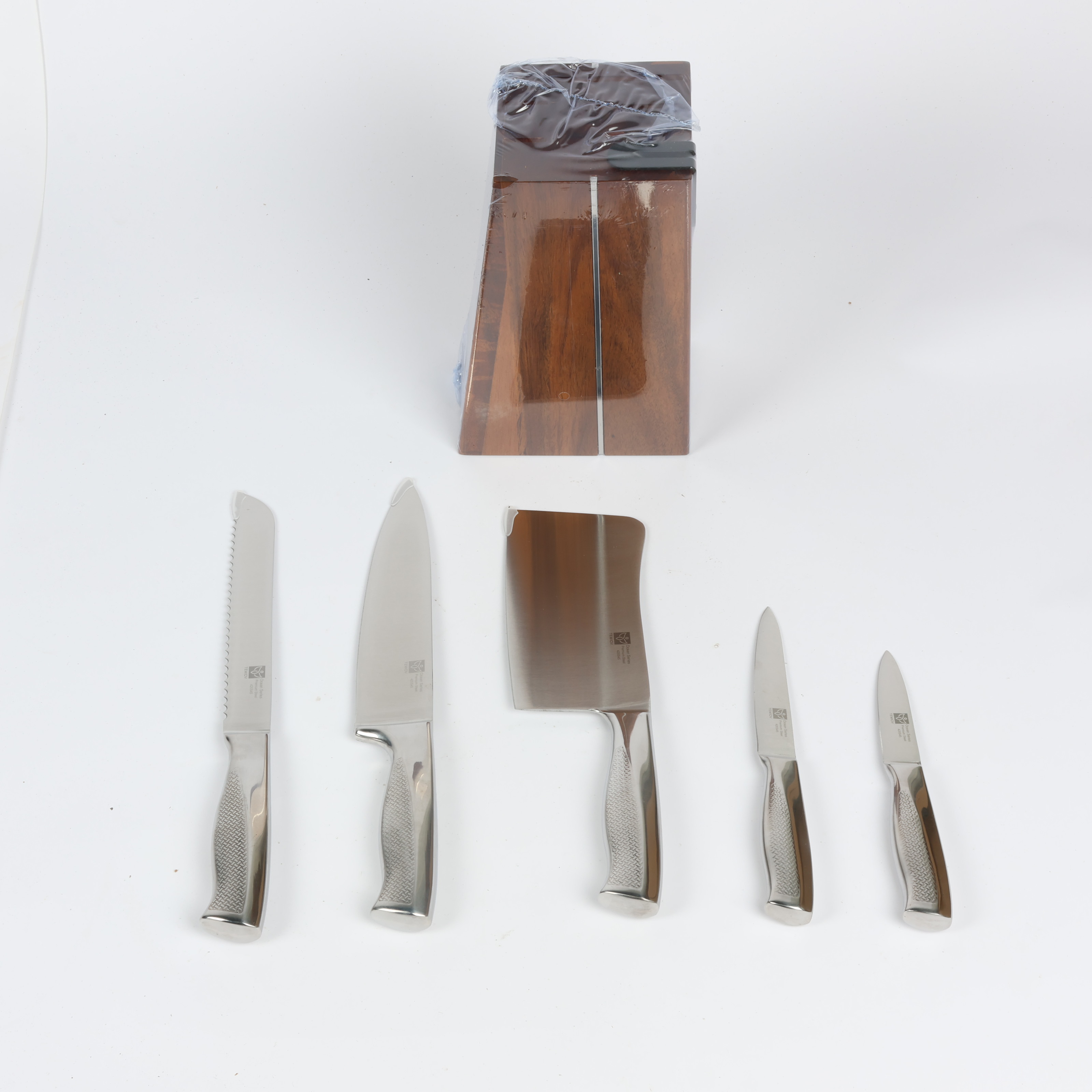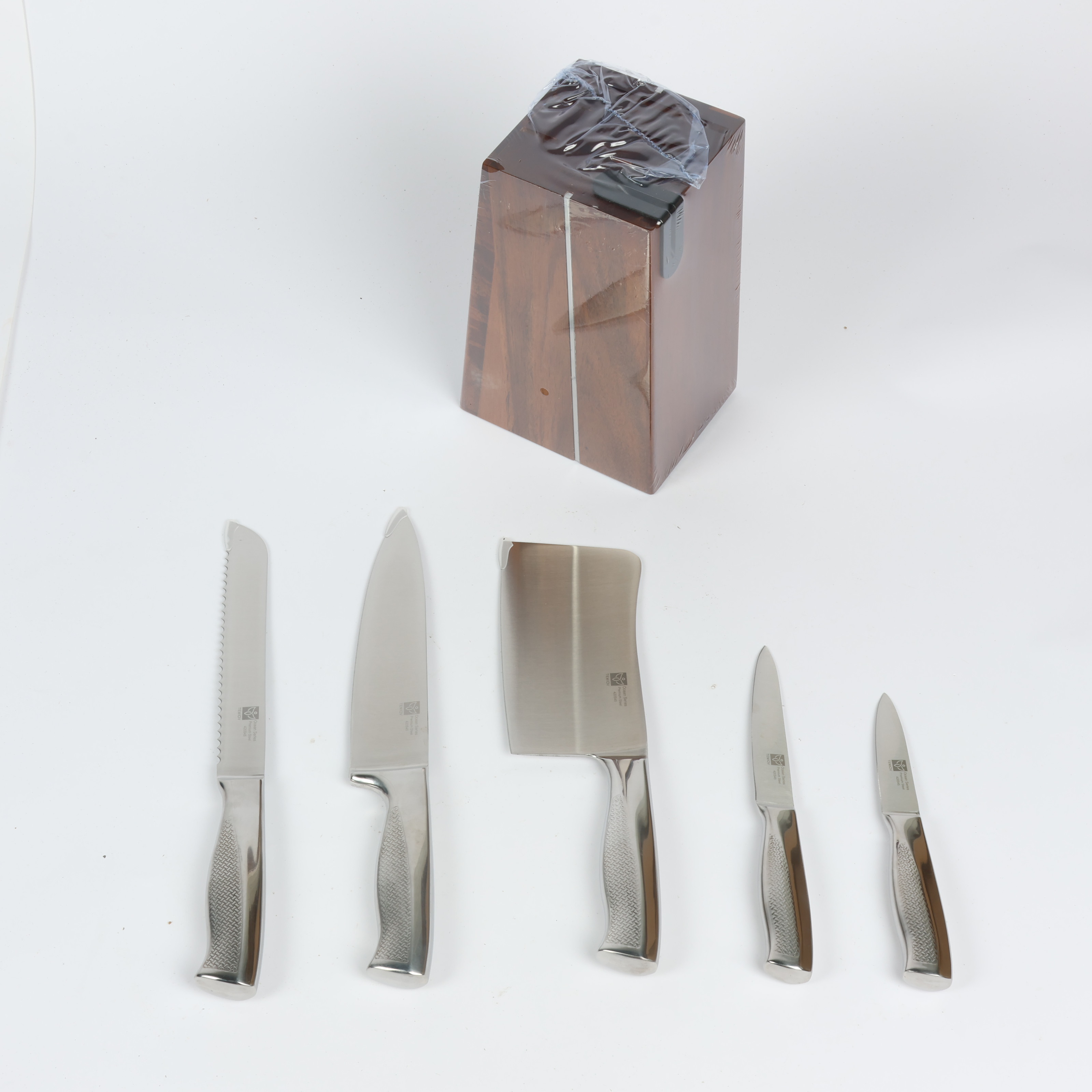 Knife Set 7-Piece with Stand: 8" Chef Knife, 8" Slicing Knife, 8" Bread Knife, 5" Utility Knife, 3.5" Paring Knife, Kitchen Scissors, and Peeler.