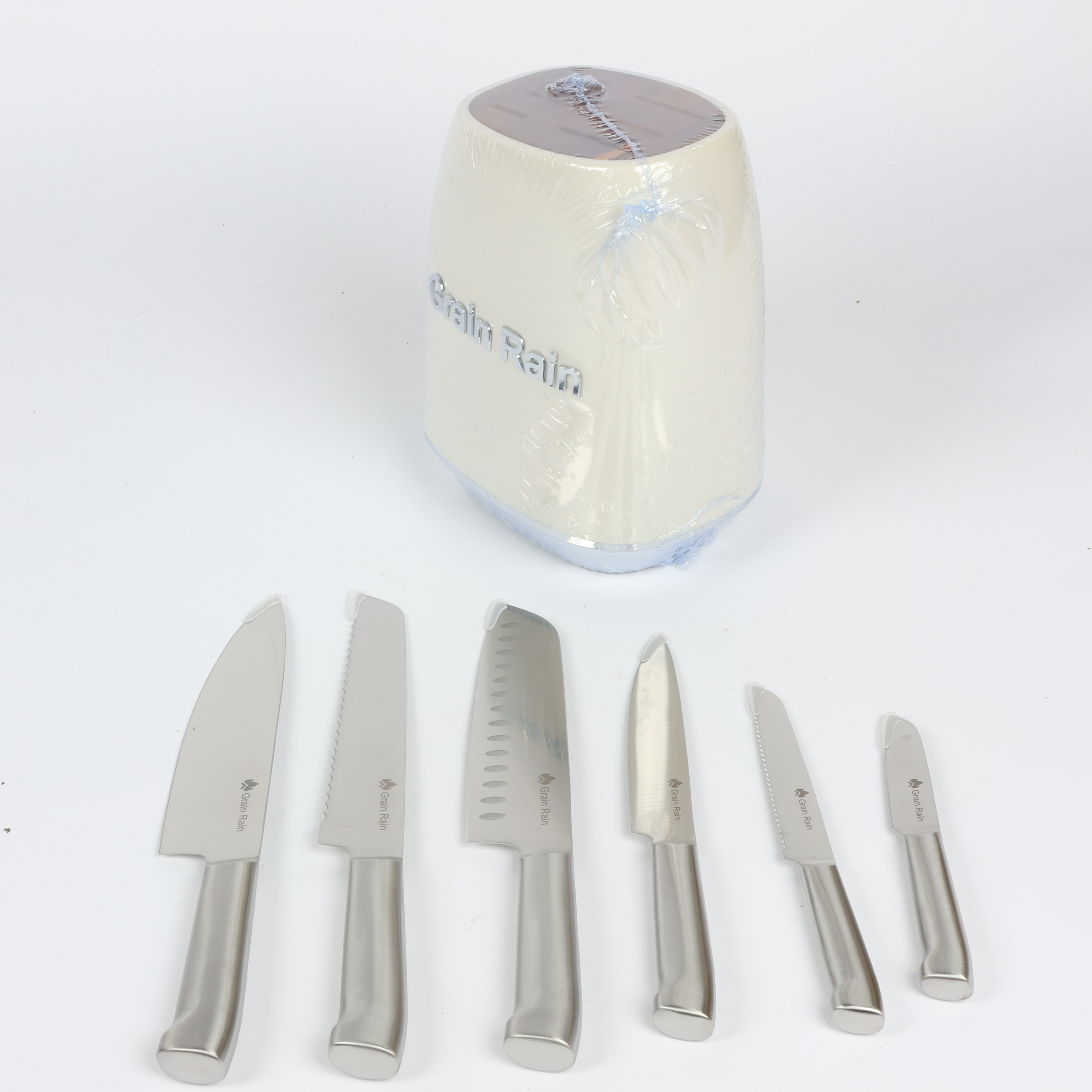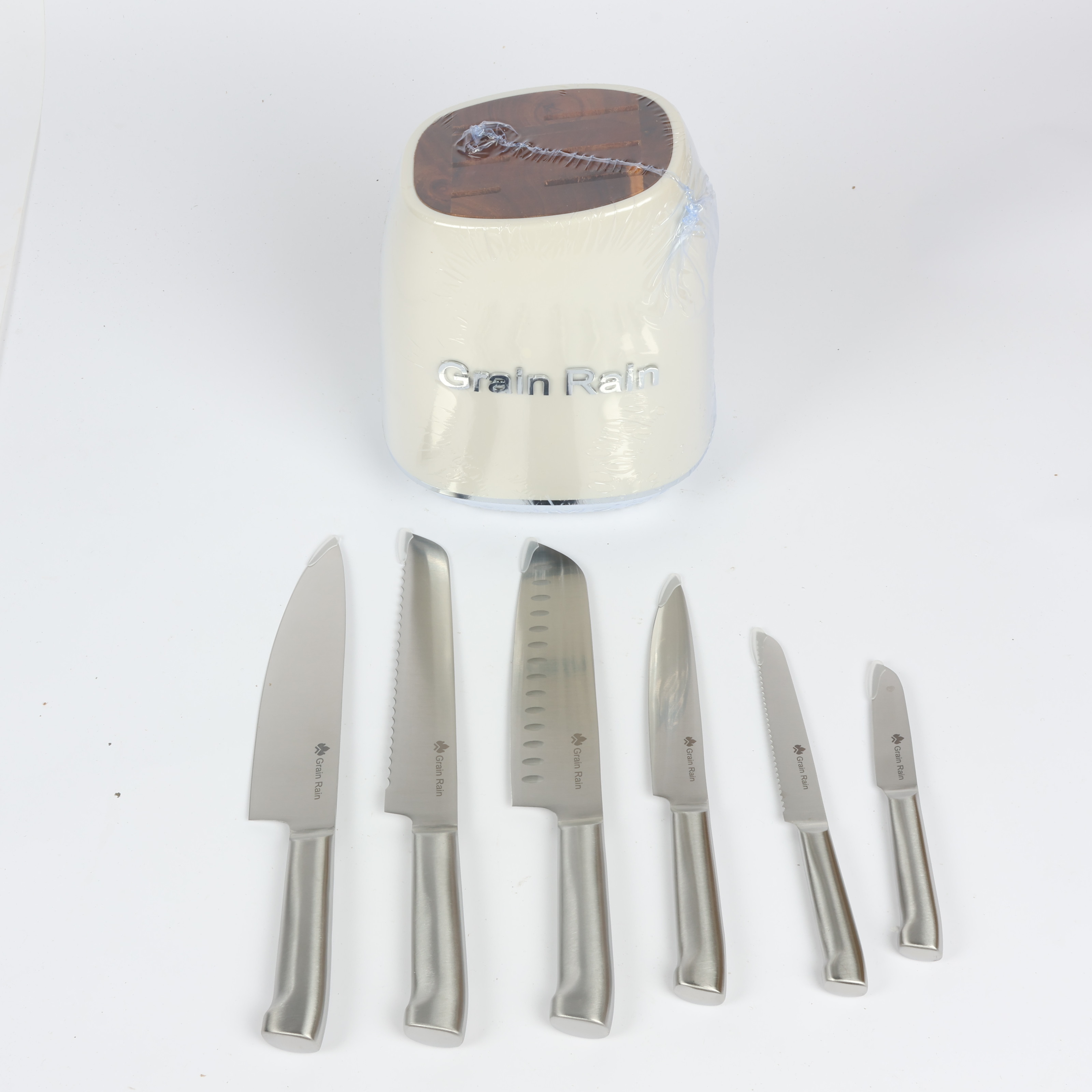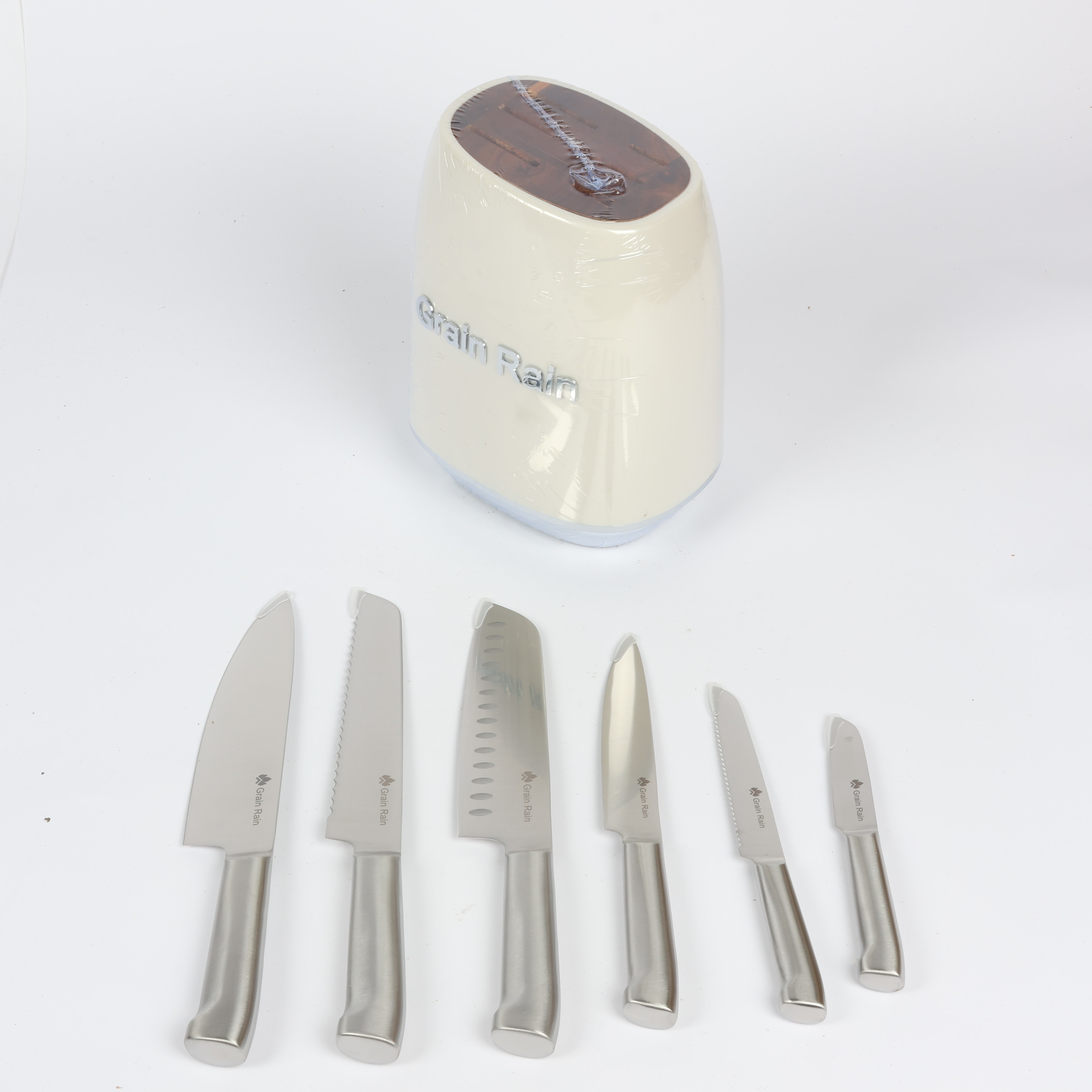 Knife Set 7-Piece with Stand: 8" Chef Knife, 8" Slicing Knife, 8" Bread Knife, 5" Utility Knife, 3.5" Paring Knife, Kitchen Scissors, and Peeler.
