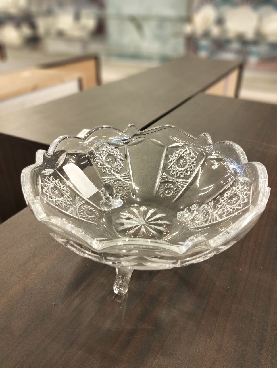 Living Home glass fruit plate, featuring a classic ornate design with shiny crystal engravings, resting on three elegant legs that provide exceptional stability and elegance