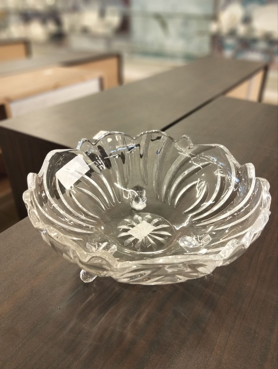 Living Home glass fruit plate, made of heavy transparent glass with intricate crystal engravings, resting on three carved glass legs