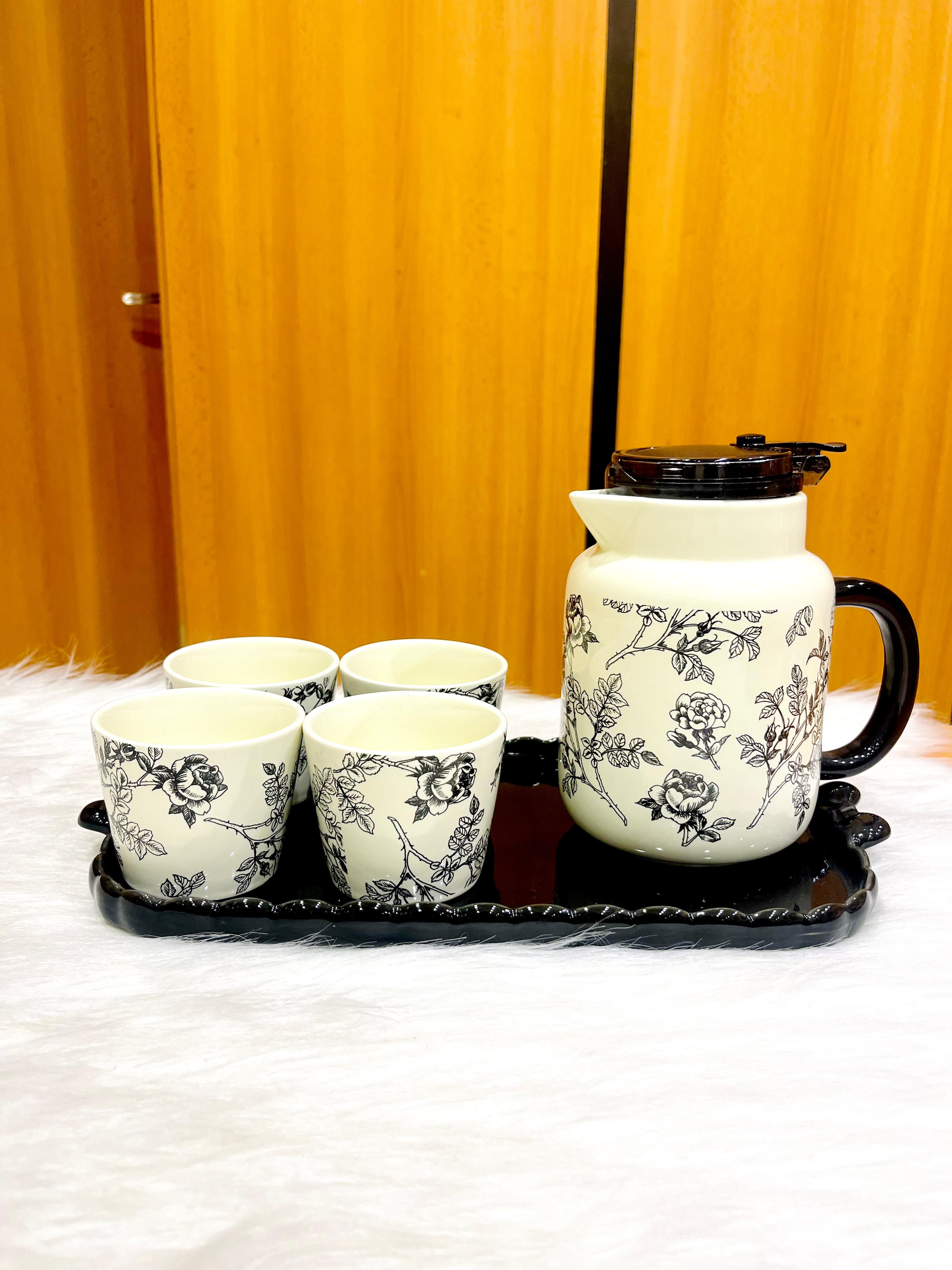 Luxury porcelain tea set, consisting of one teapot, four cups, and one tray