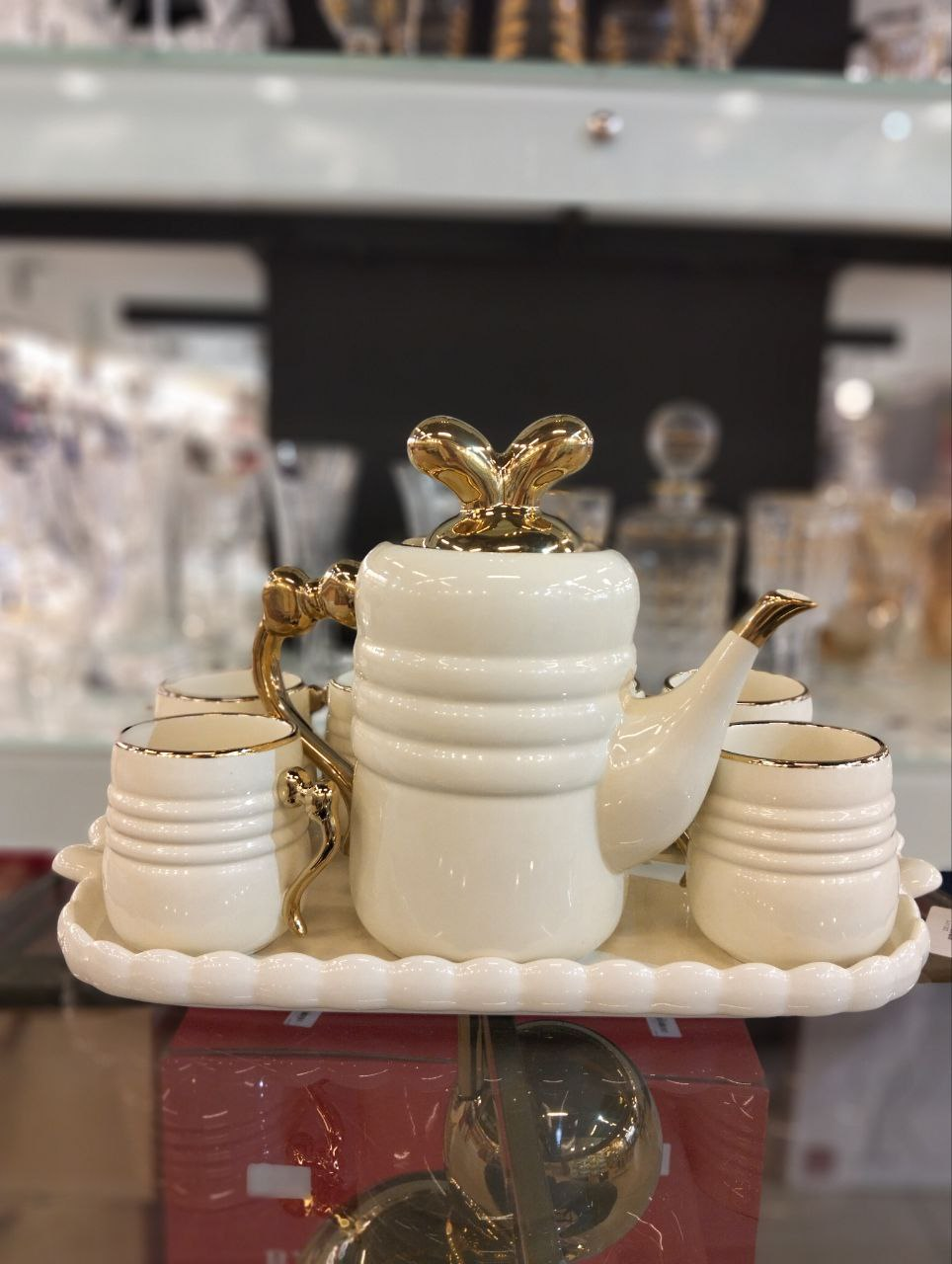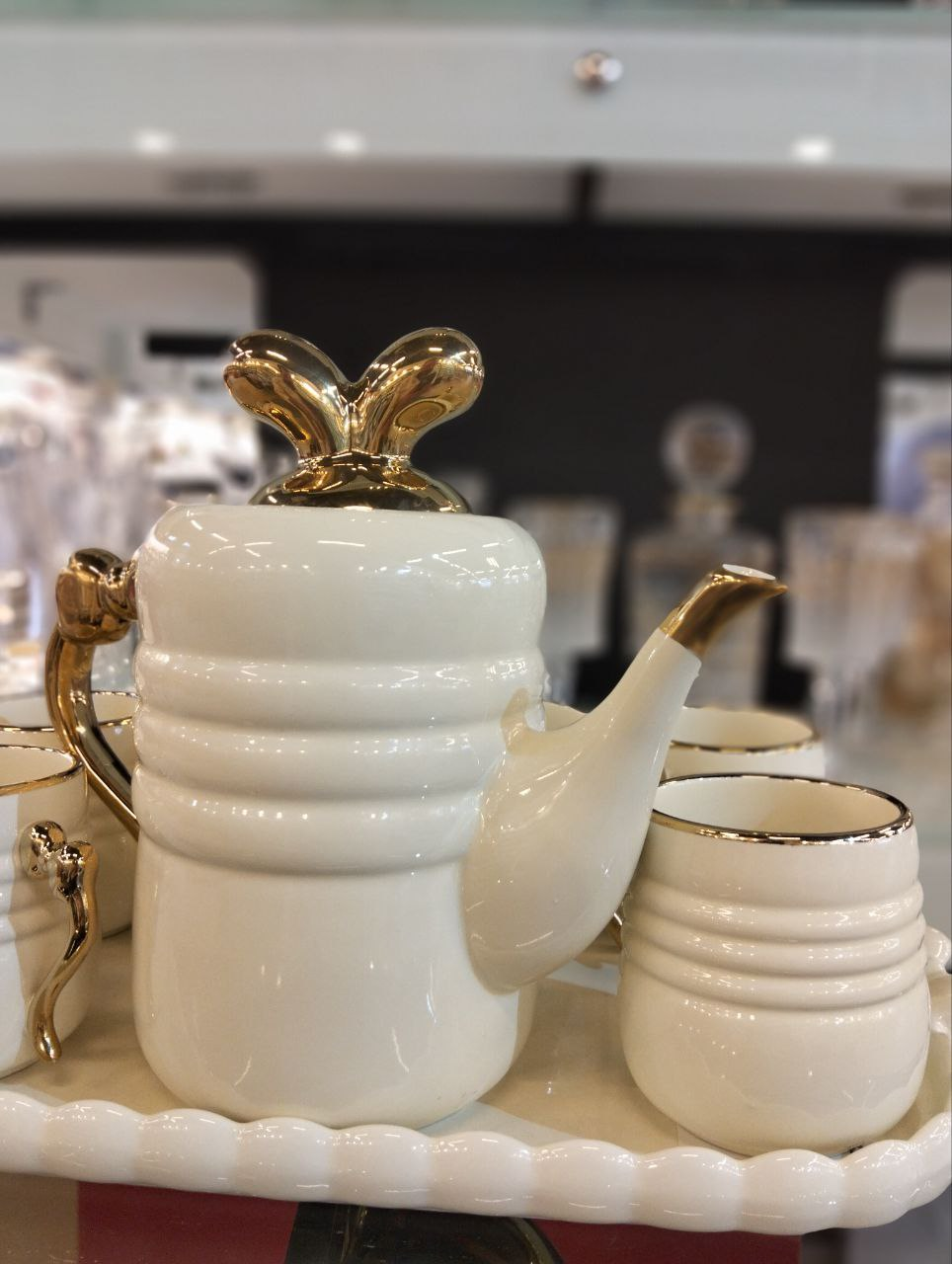 Luxury porcelain tea set with golden touches, consisting of one teapot, four cups, and one rectangular tray