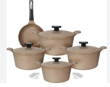 Neoflam Granite Pot Set, Beige, 11-Piece Grooved, Pots (20-22-24-28 cm) + Fry Pan 24 + 2 Silicone Holders