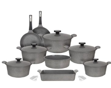 Neoflam Granite Pot Set, Gray marble , 14-Piece Grooved, Pots (20-22-24-26-28 cm) + Fry Pan 26 + Wok 30 + Casserole 28 + Baking Tray 28