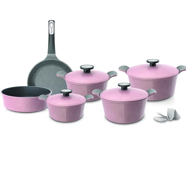 Neoflam Granite Ribbed Cookware Set 10 pcs Rose – Includes pots 20-22-26-28 cm + 24 cm frying pan + 28 cm grill pan + 2 silicone handles