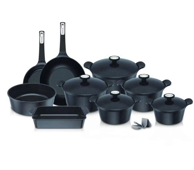 Neoflam Granite Ribbed Cookware Set 14 pcs Black – Includes pots 20-22-24-26-28 cm + 28 cm grill pan + 26 cm frying pan + 30 cm wok