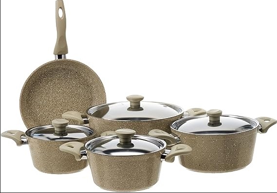 Neoflam Granite Ribbed Cookware Set 9 pcs Beige includes pots 20-22-24-26 cm plus 26 cm frying pan and 2 silicone handles