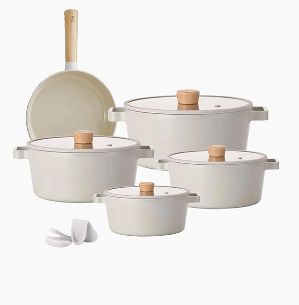 Neoflam Granite Vika Cookware Set 11 pcs Beige – Includes pots 16-22-24-26 cm + 24 cm frying pan + 2 silicone handles