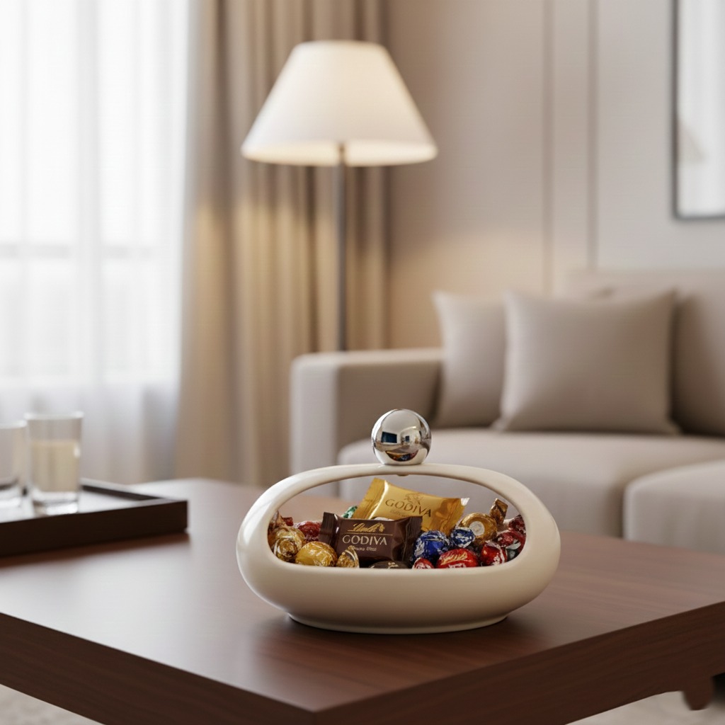 Bonbonniere, neutral color, oval shape with a modern hollow design, perfect for serving sweets.