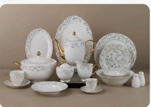 Oxford dining set 60 pcs round featuring contrast between classic geometric pattern and delicate floral pattern