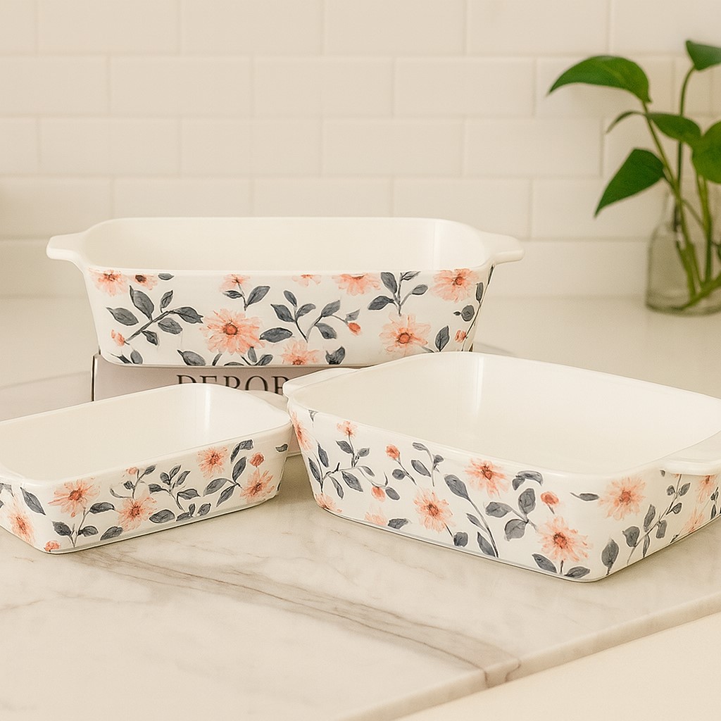 Porcelain Casserole Set, 3 Pieces, Rectangular, Floral Design White Interior - abdo-67-216 D