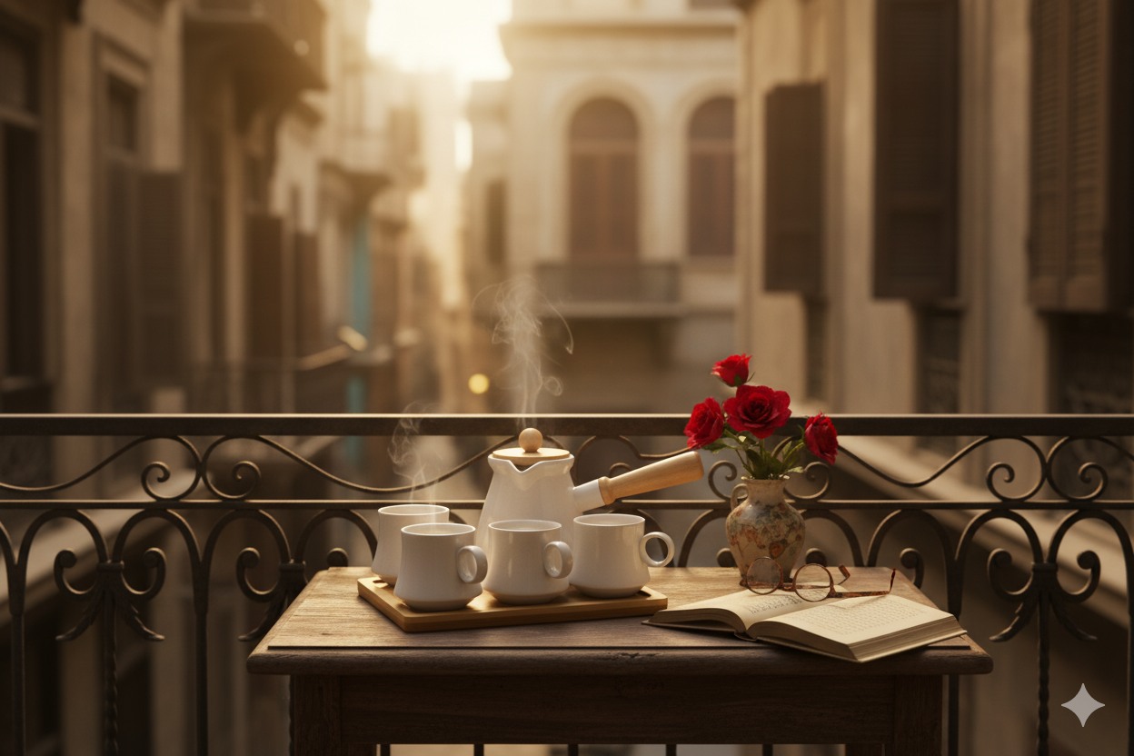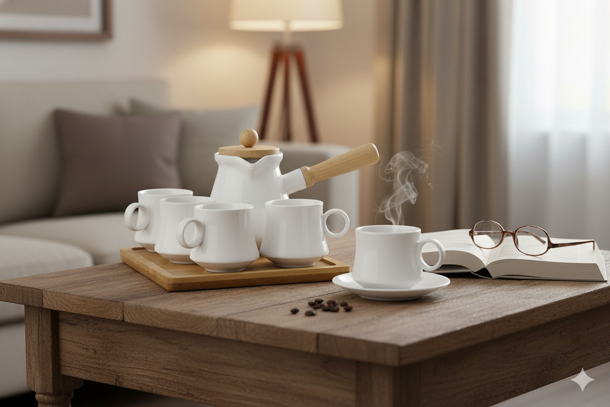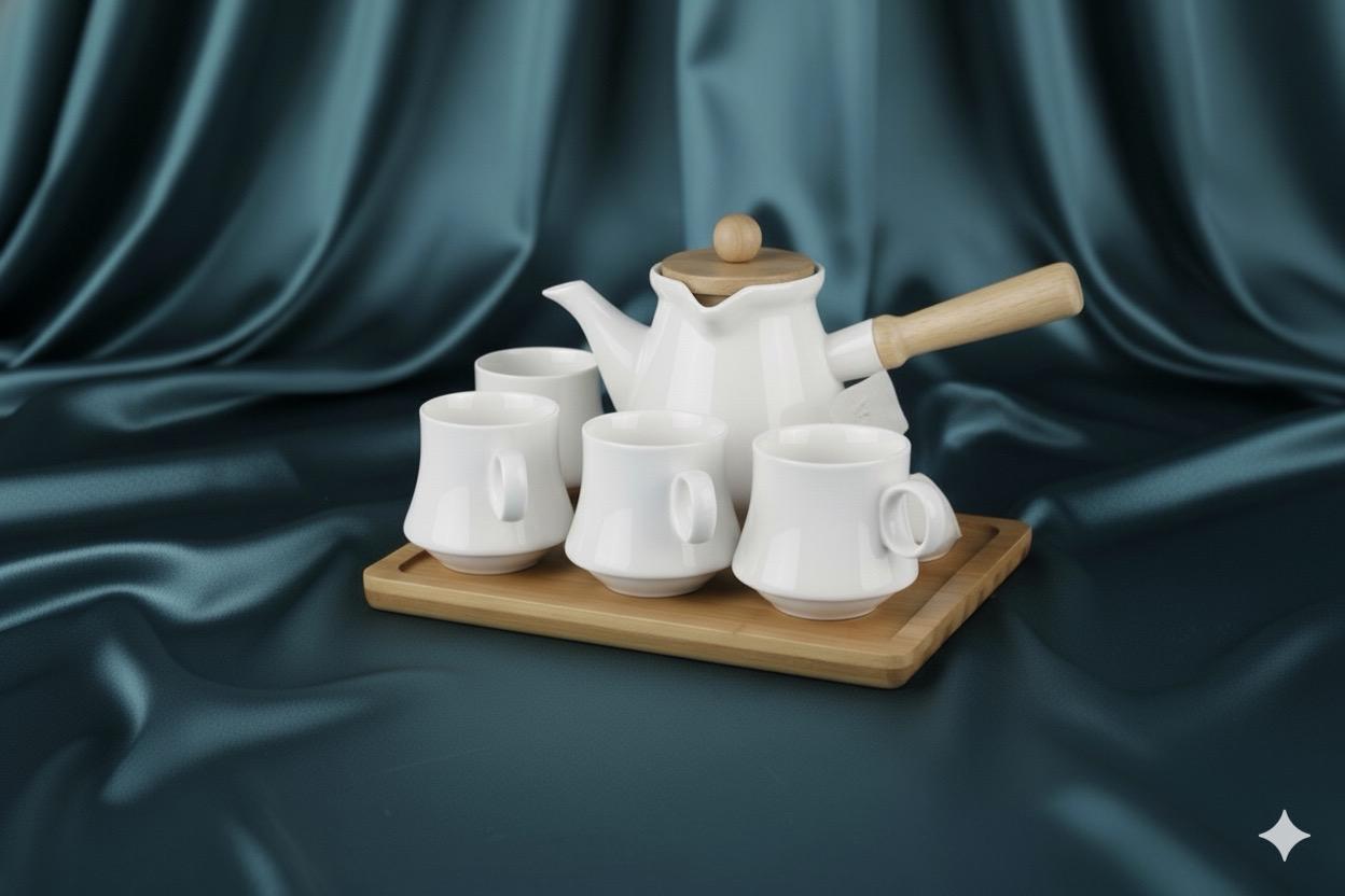 Porcelain coffee set consisting of porcelain coffee pot with 4 porcelain mugs and wooden tray