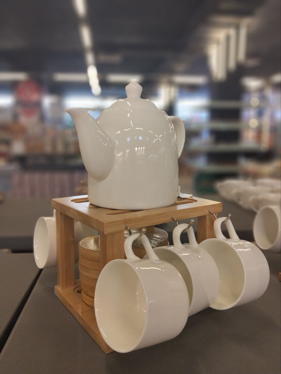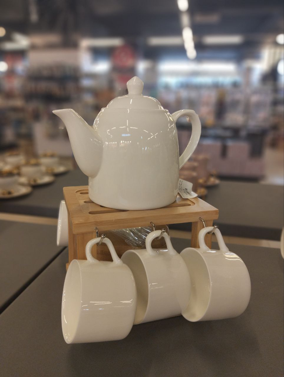 Porcelain tea set consisting of a teapot, 6 white porcelain cups, 6 heart-shaped wooden coasters, and a multi-purpose wooden holder