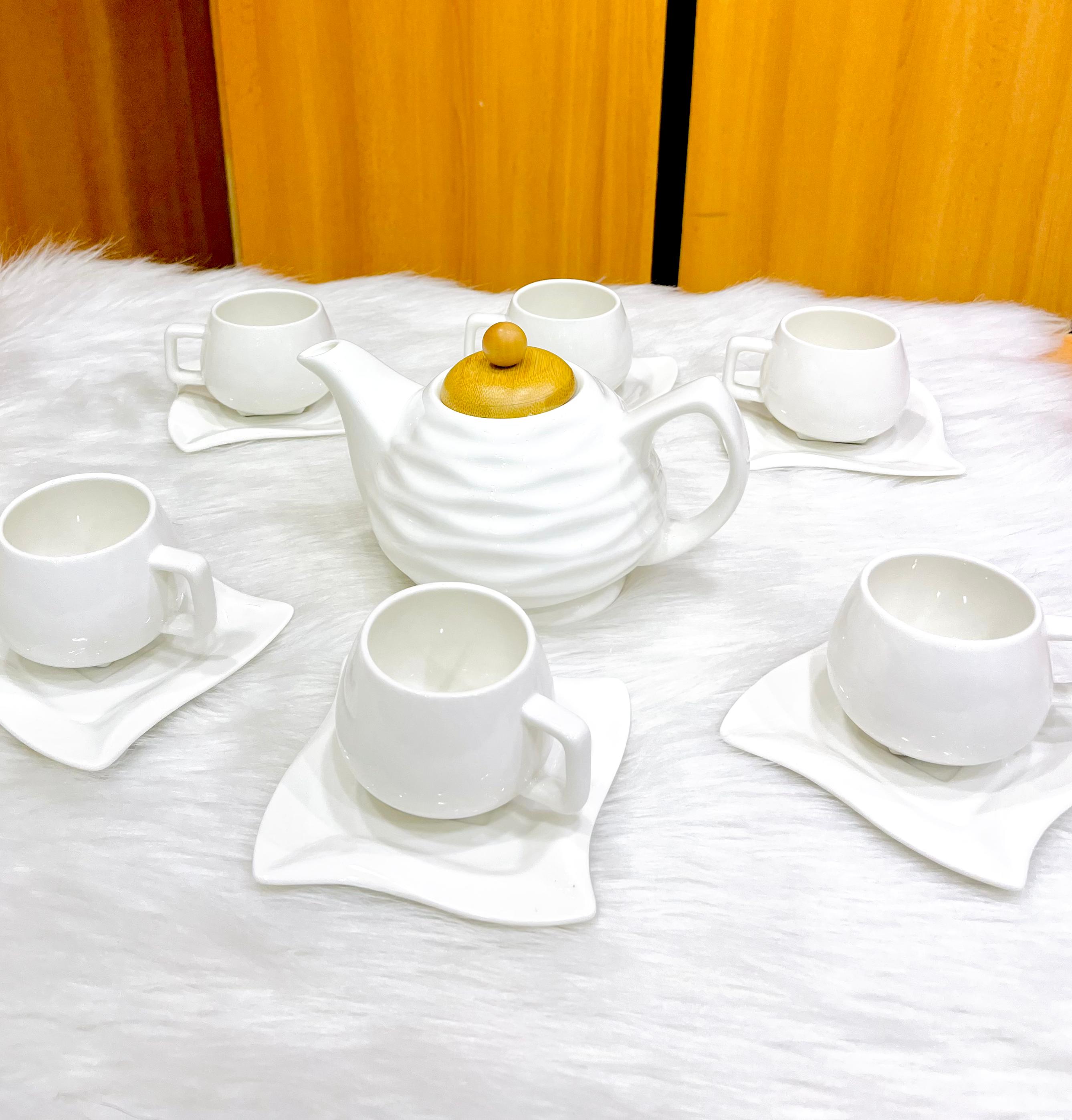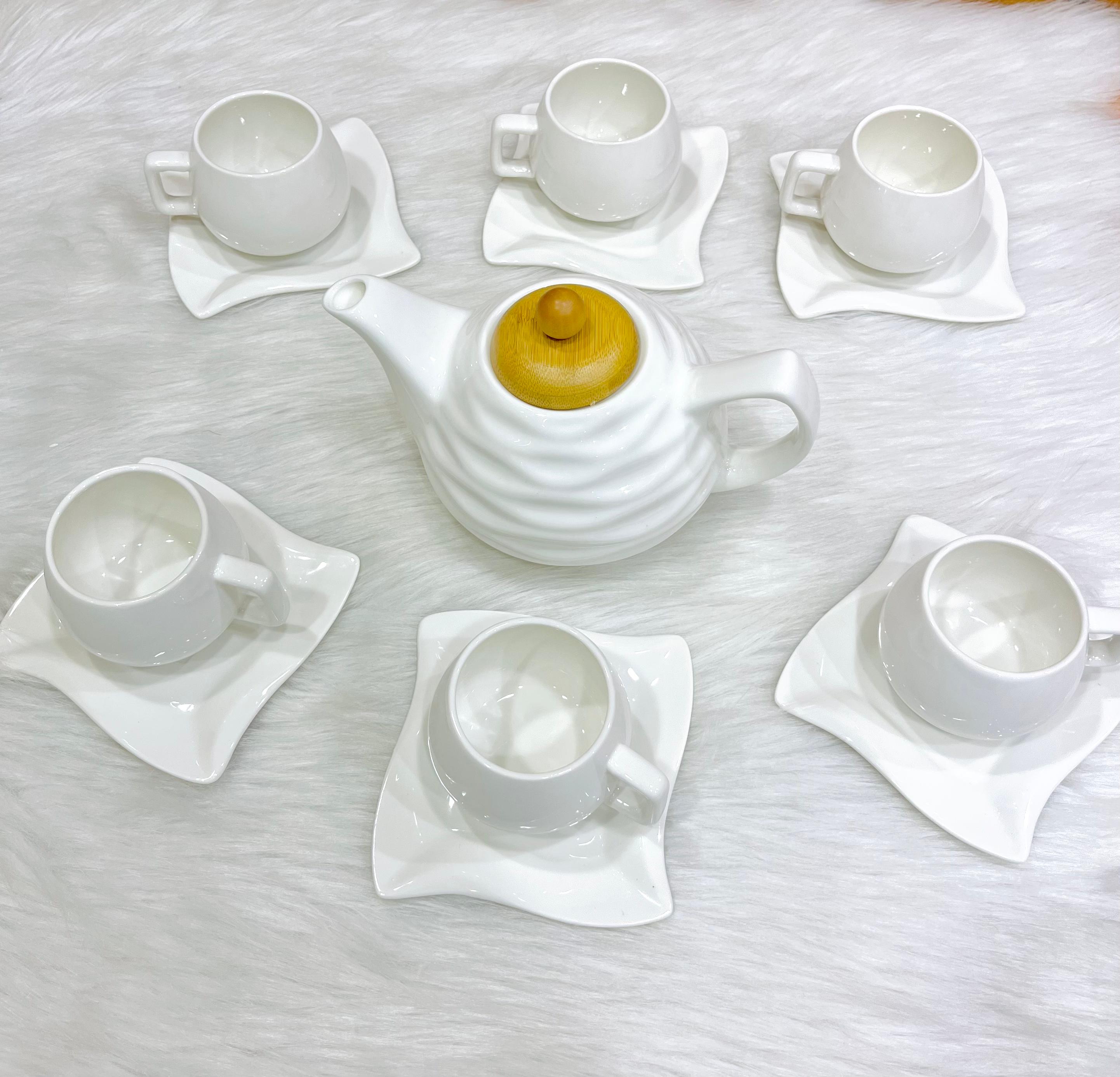 Porcelain tea set consisting of teapot 6 cups with saucers and elegant wooden holder for organized display and serving