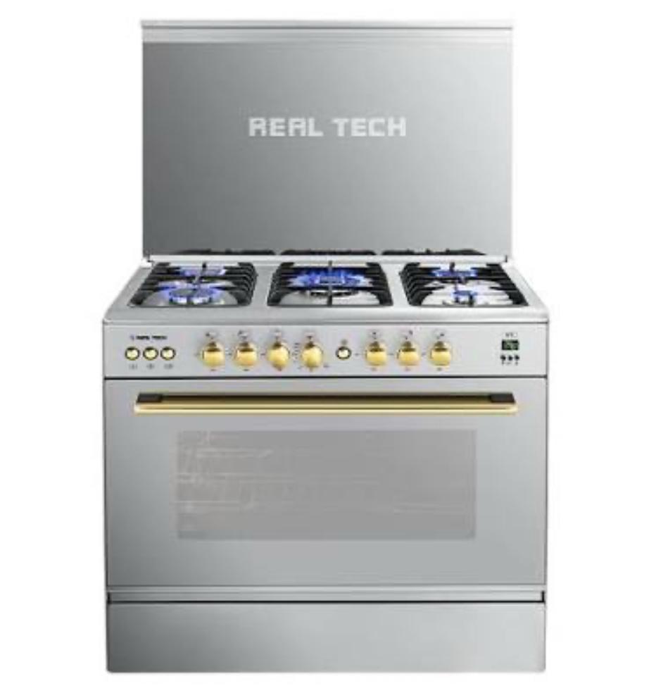Real Tech Cooker, Art Gold Model – 90×60 | Italian Oven Chambers | Fan | Wide Stand | Digital | Easy-Clean Door | Oven Side Grids | Full Safety