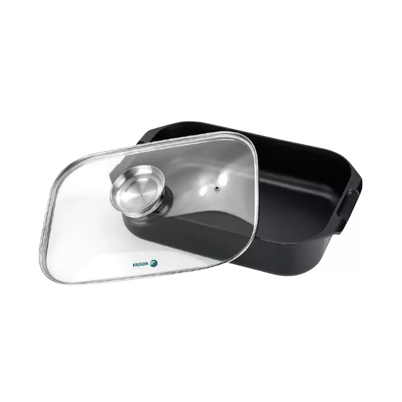 Fagor Future Multi-Purpose Roaster with Lid, 40×25 cm, made of cast aluminum with a double non-stick Xylan Plus coating and an ImpactSteel heat-diffusing base. Features a heat-resistant glass lid with