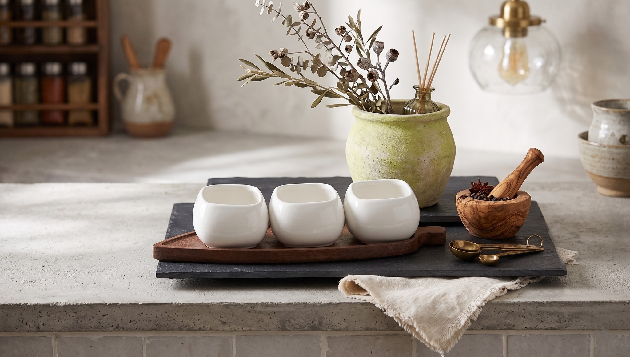 Serving Set 3-Piece of white porcelain bowls with a sleek square design, presented on a natural wooden base with an innovative elongated shape.
