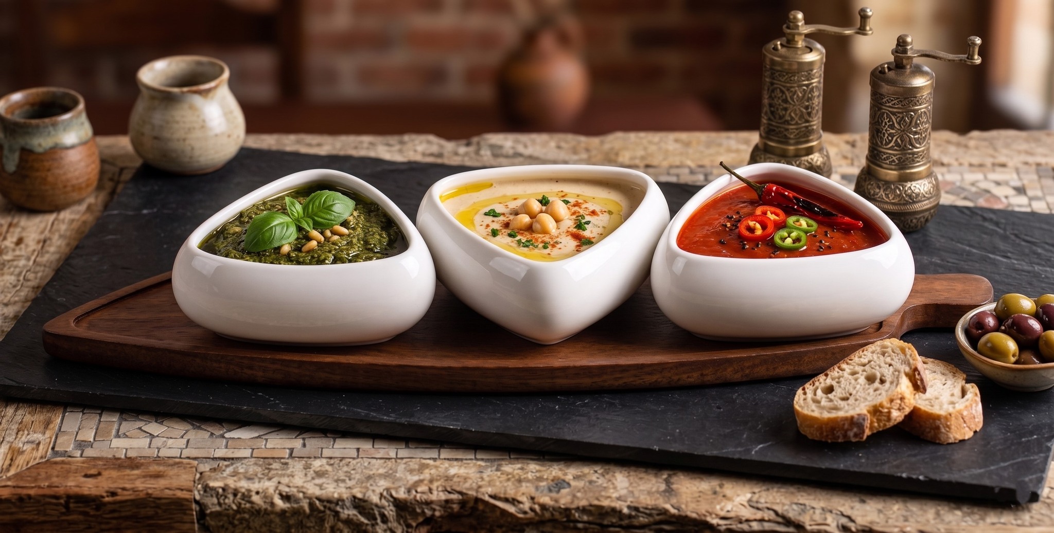 Serving Set 3-Piece of white porcelain bowls with an attractive, sleek triangular design, arranged on a natural wooden base with a distinctive elongated style.
