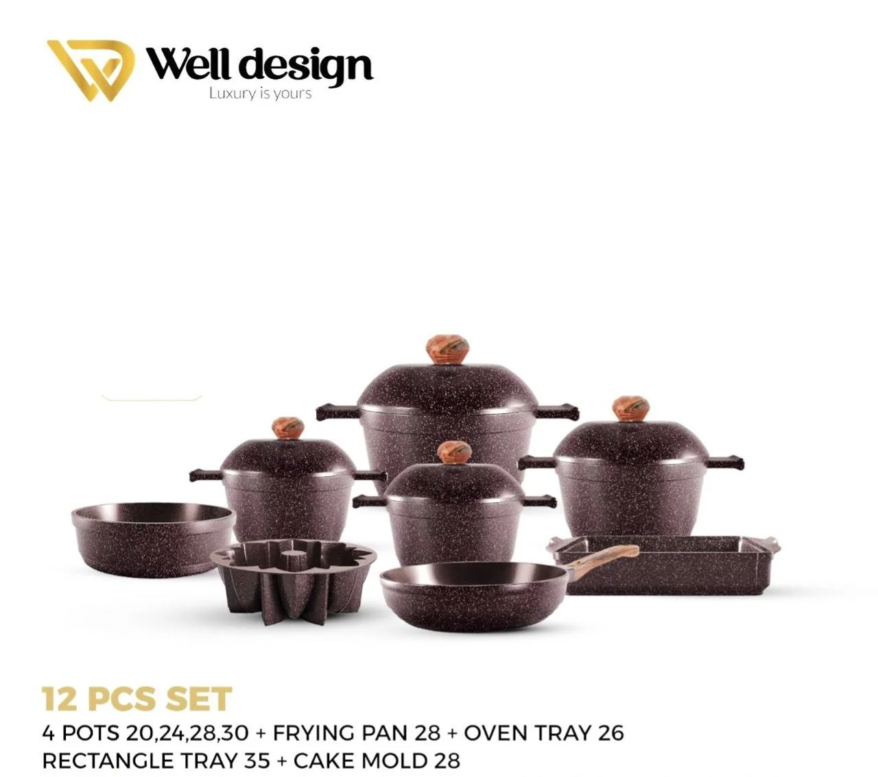 Set Die-Cast (well design) 12 pcs ( Pot 20&24&28&32 cm+ Fry Pan 28 cm)+Roun Oven 26+Rostar35-cake mould 28 + geft 5 pcs tools + 2 pcs silicone) Maroon