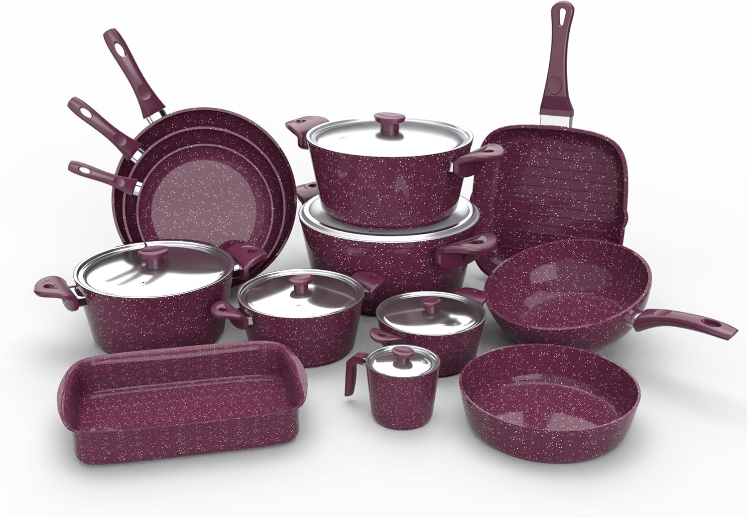 Top Chef Granite Pot Set 19 Pieces, consisting of 5 Pots (18-20-24-28-30), 3 Frying Pans (20-24-30), a 30 cm Tagine, a 26 cm Baking Tray, and a 16 cm Saucepan in Burgundy