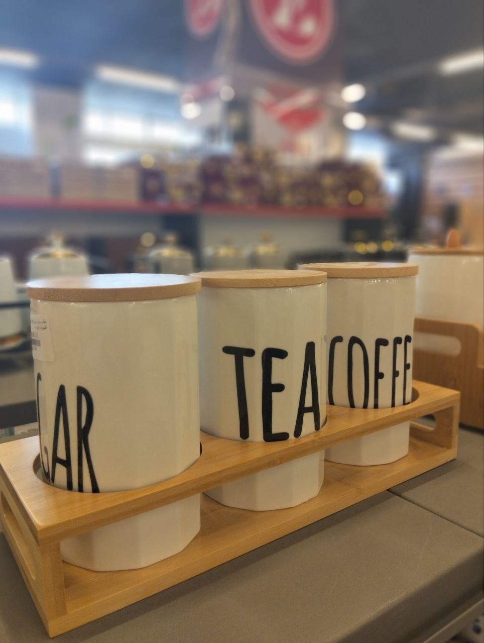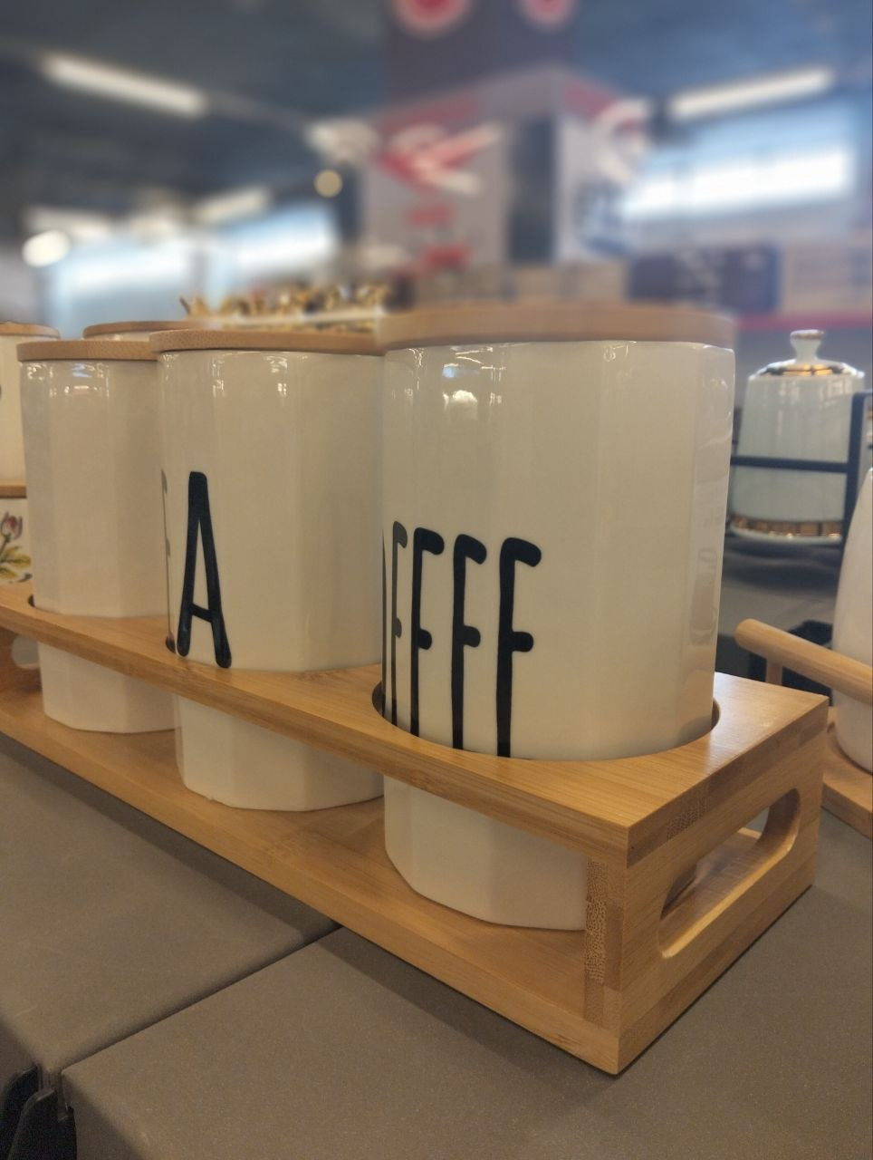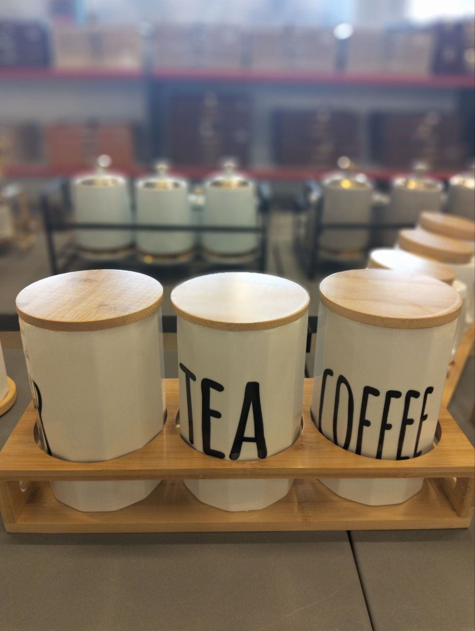 Set of 3-piece porcelain sugar jars for storing tea coffee and sugar with wooden lids and elegant wooden base modern and simple design