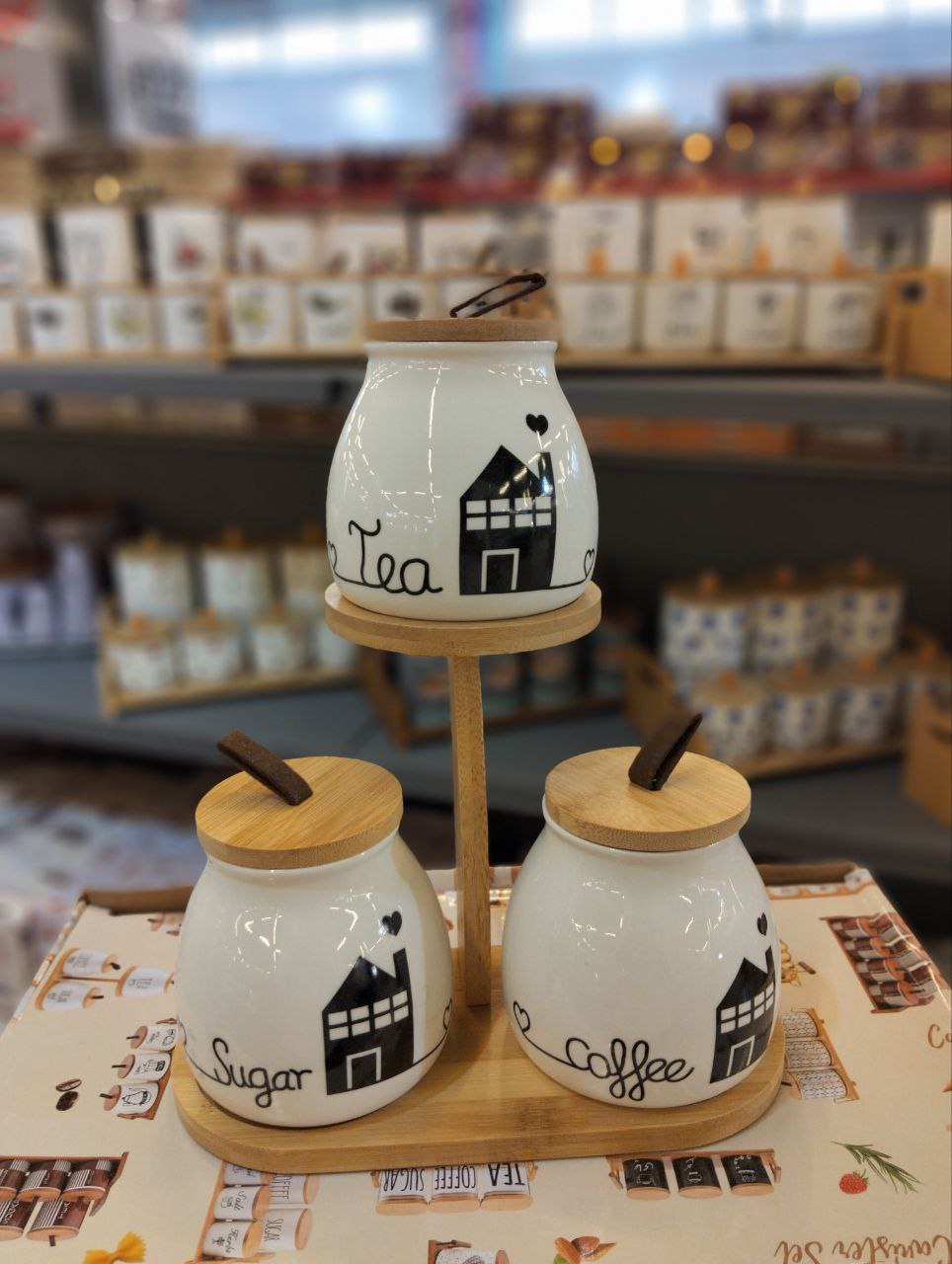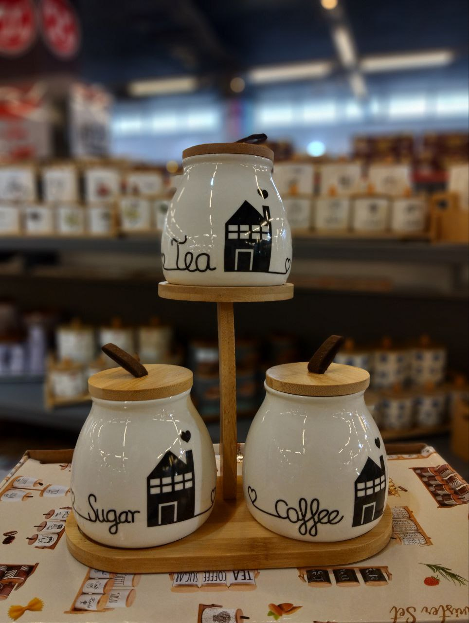 Set of 3-piece porcelain sugar jars for storing tea sugar and coffee with cute home design and wooden lids with multi-level wooden display base