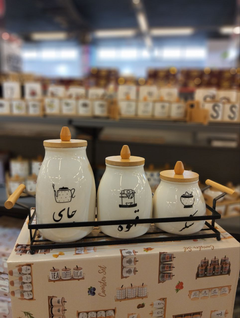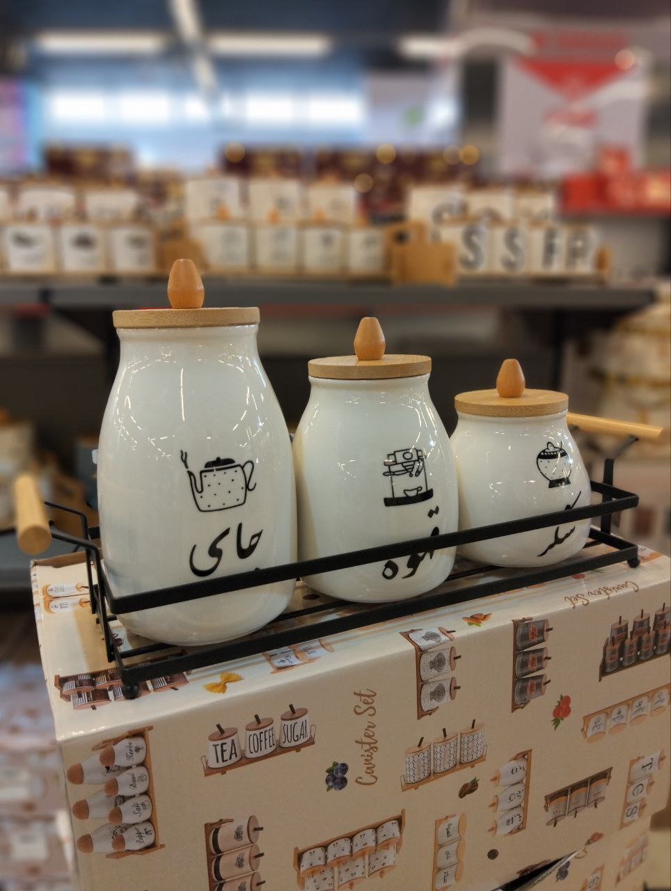 Set of 3-piece porcelain sugar jars for tea coffee and sugar white porcelain with Persian drawings and wooden lids inside metal holder