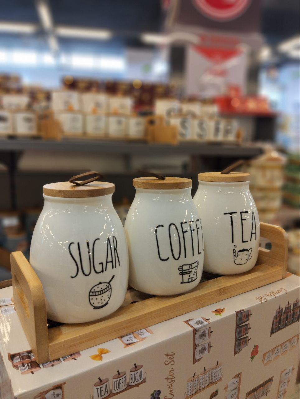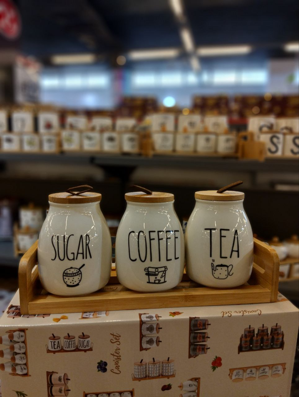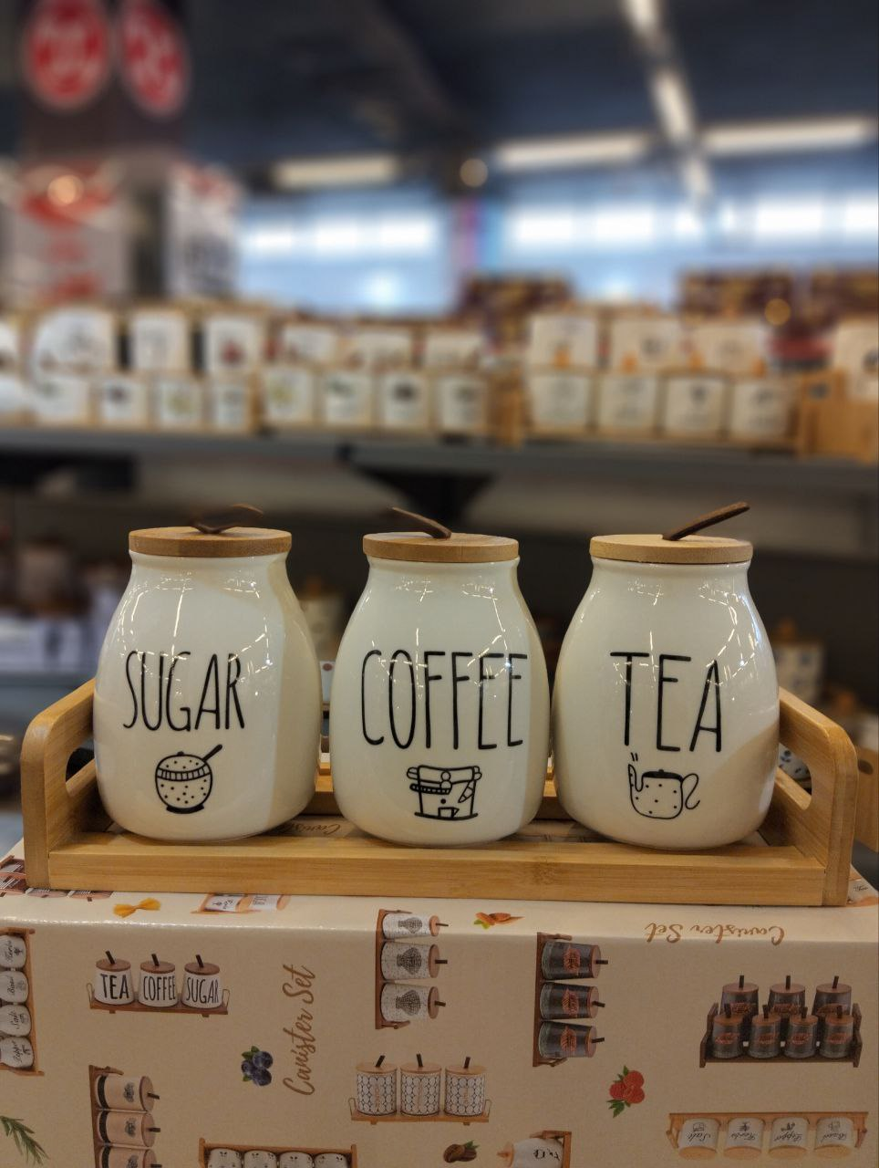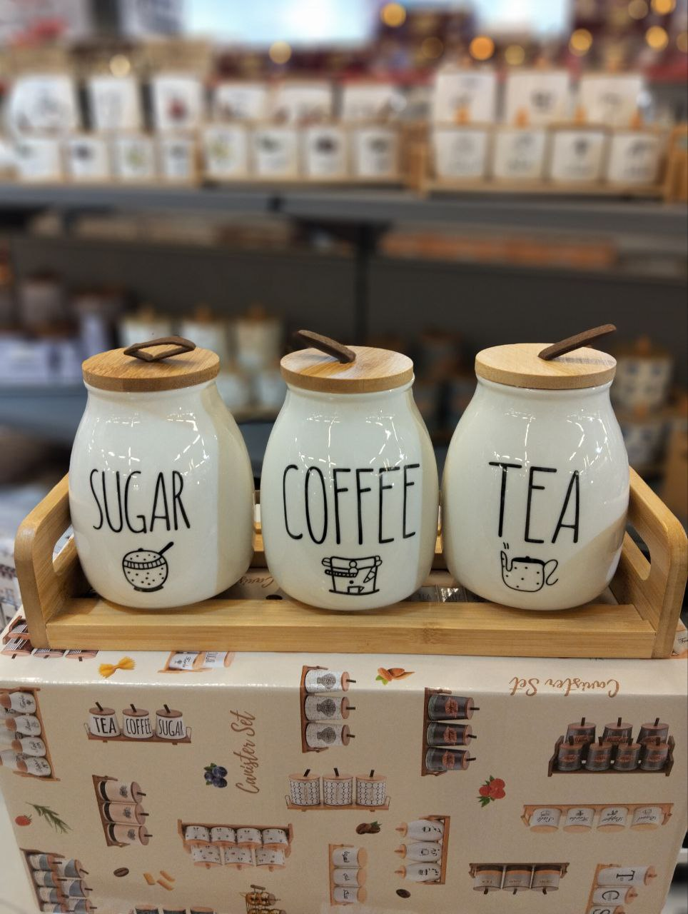 Set of 3-piece sugar jars for tea coffee and sugar with white ceramic and bamboo lids with leather ring handle for practical organization