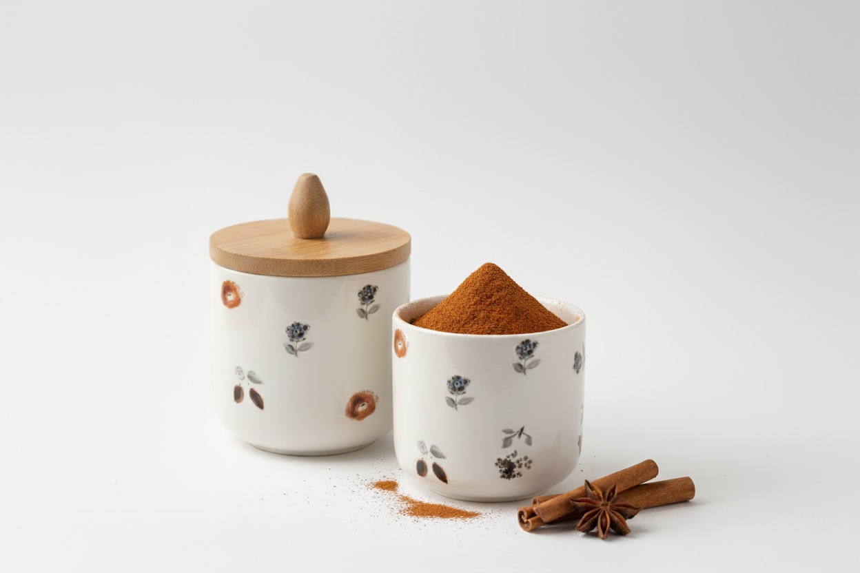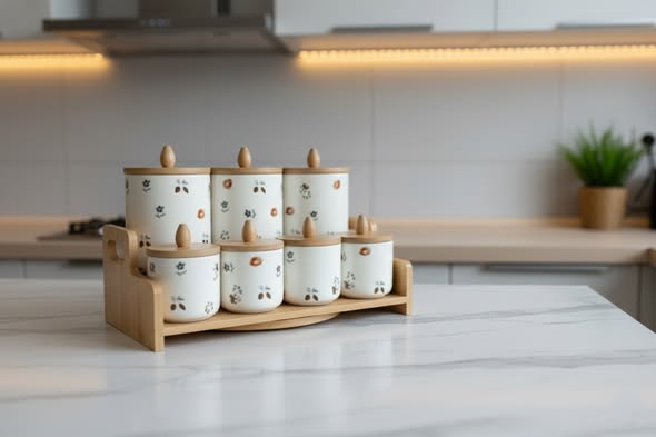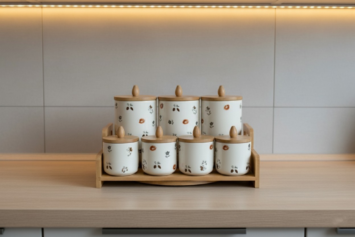 Set of 7-piece creamy porcelain spice jars with natural light wooden lids with conical handles including 3 tall and 4 short jars placed inside a matching wooden tray ideal for kitchen organization