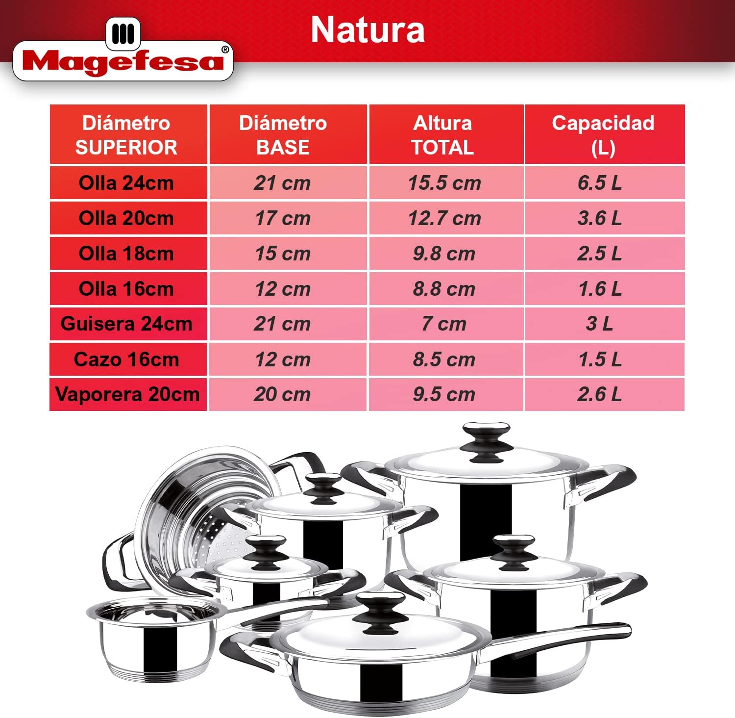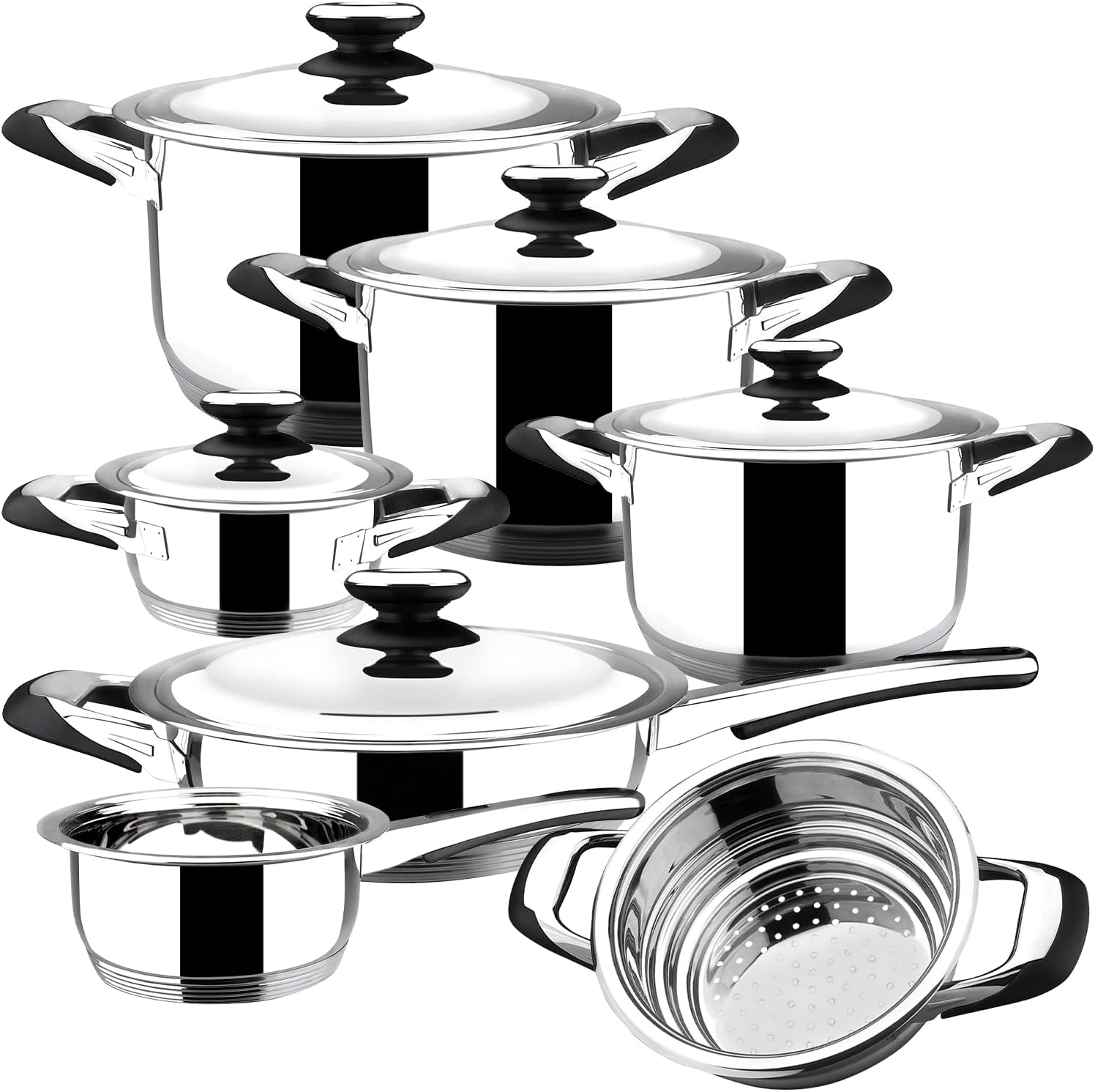 Stainless set 12 pieces. 4 pots size 16,18,20,24, casserole size 16, frying pan size 24, and sauteed vegetables for all sizes of pots