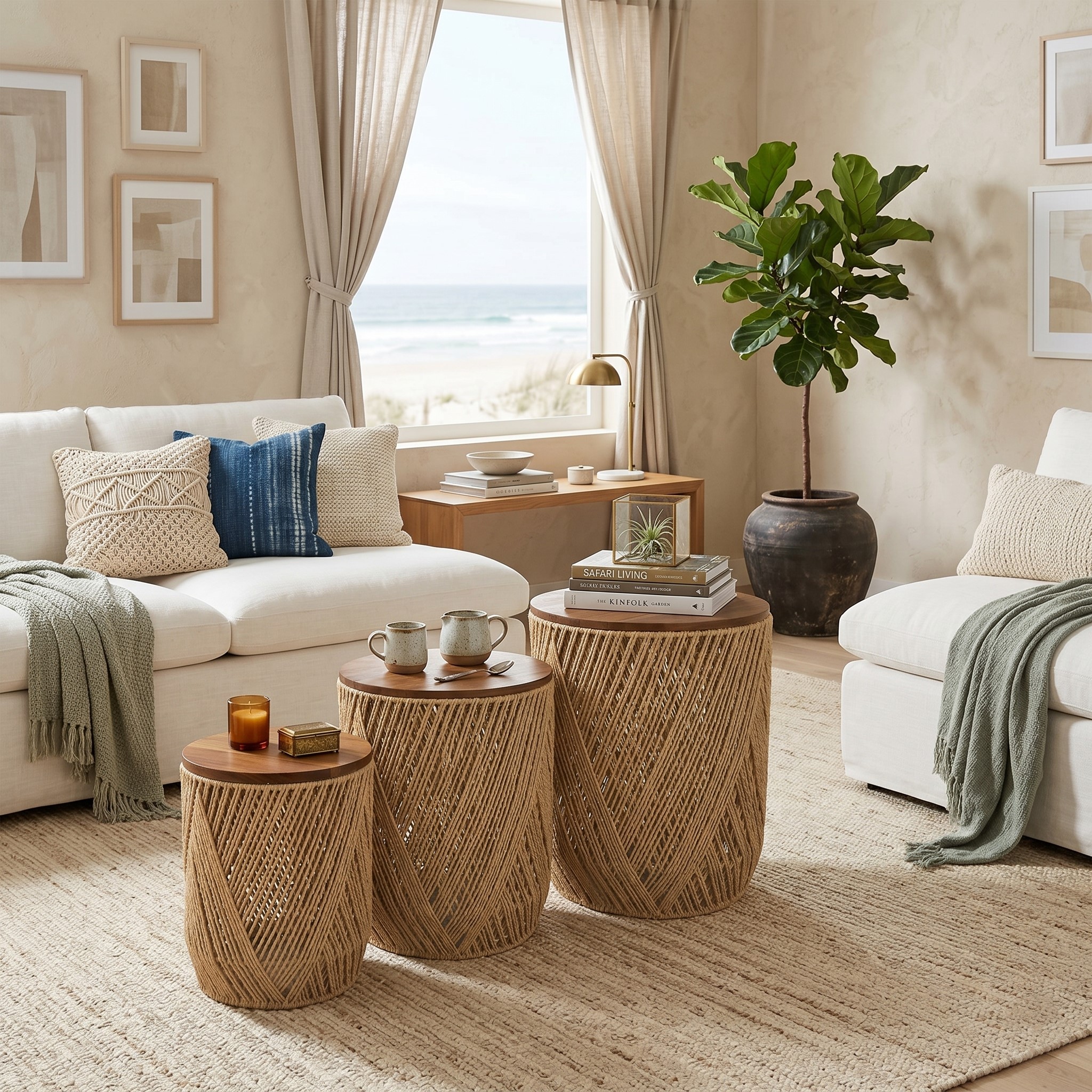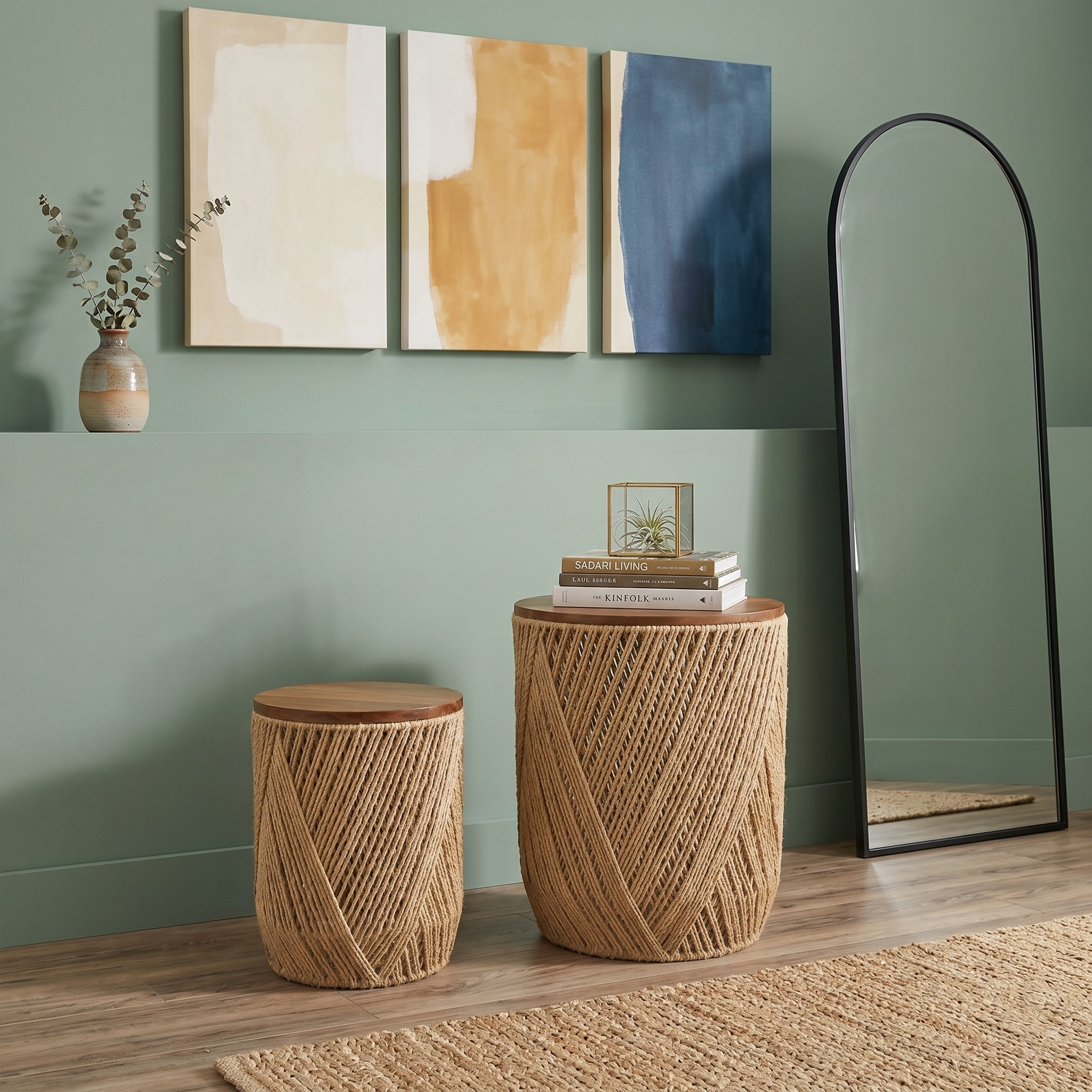 table set 3-piece with a modern woven design and an elegant round top. Dimensions: 30×23×H24.5 cm, 35×30×H40 cm, 40×34×H45 cm.
