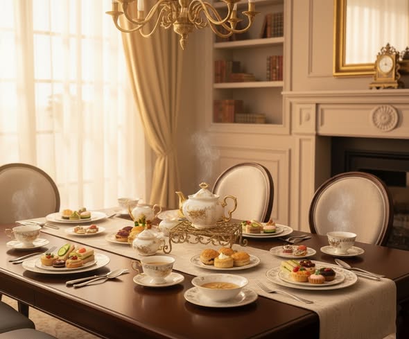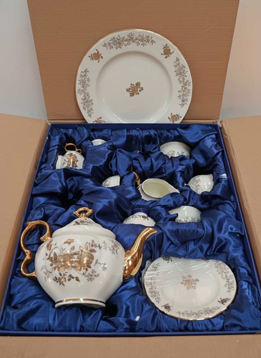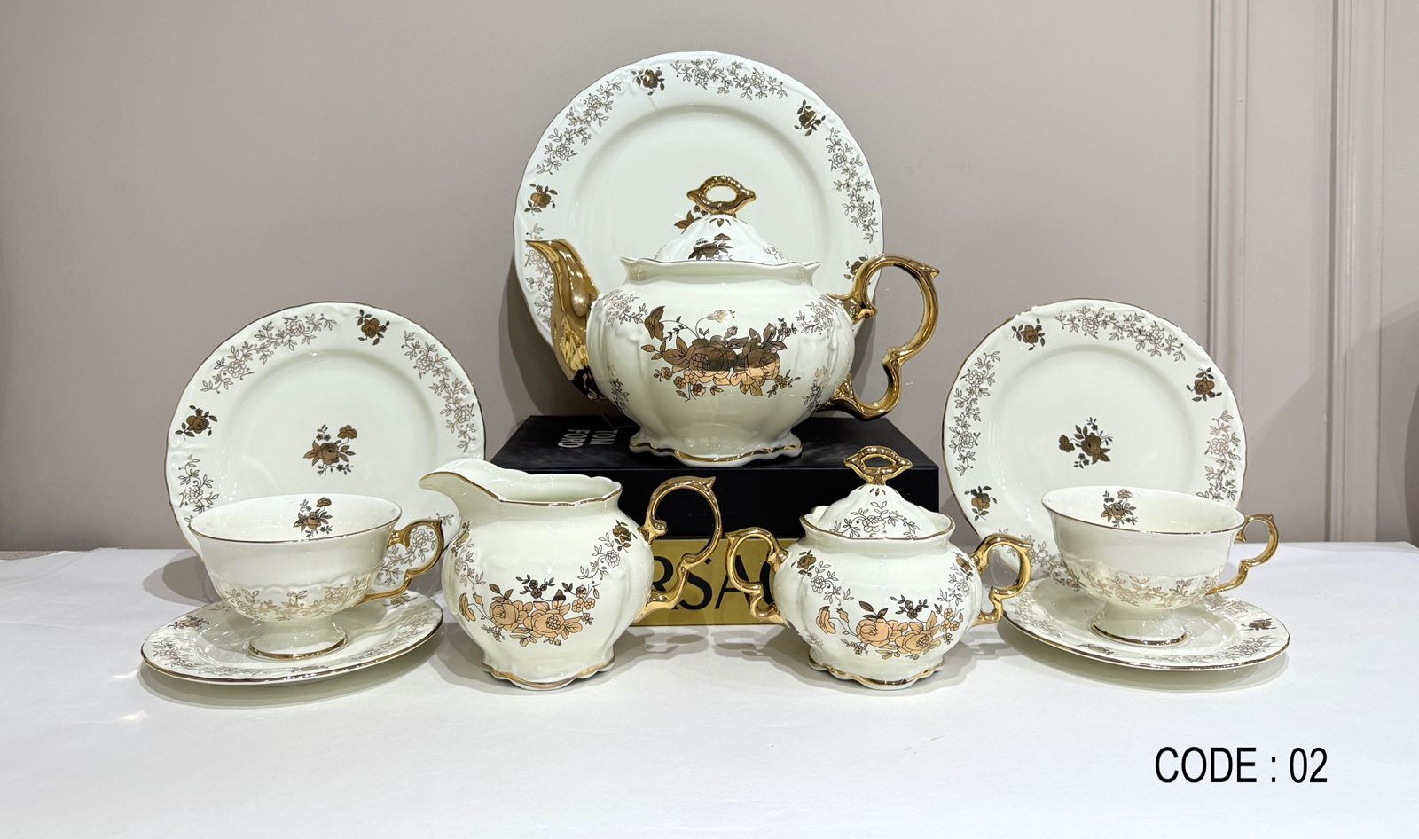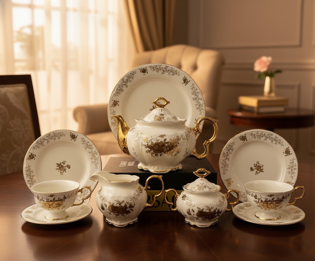 Tea and cake set, 24 pieces, Thai made, Elegant brand, creamy white decorated with golden and brown floral patterns with luxurious golden touches.