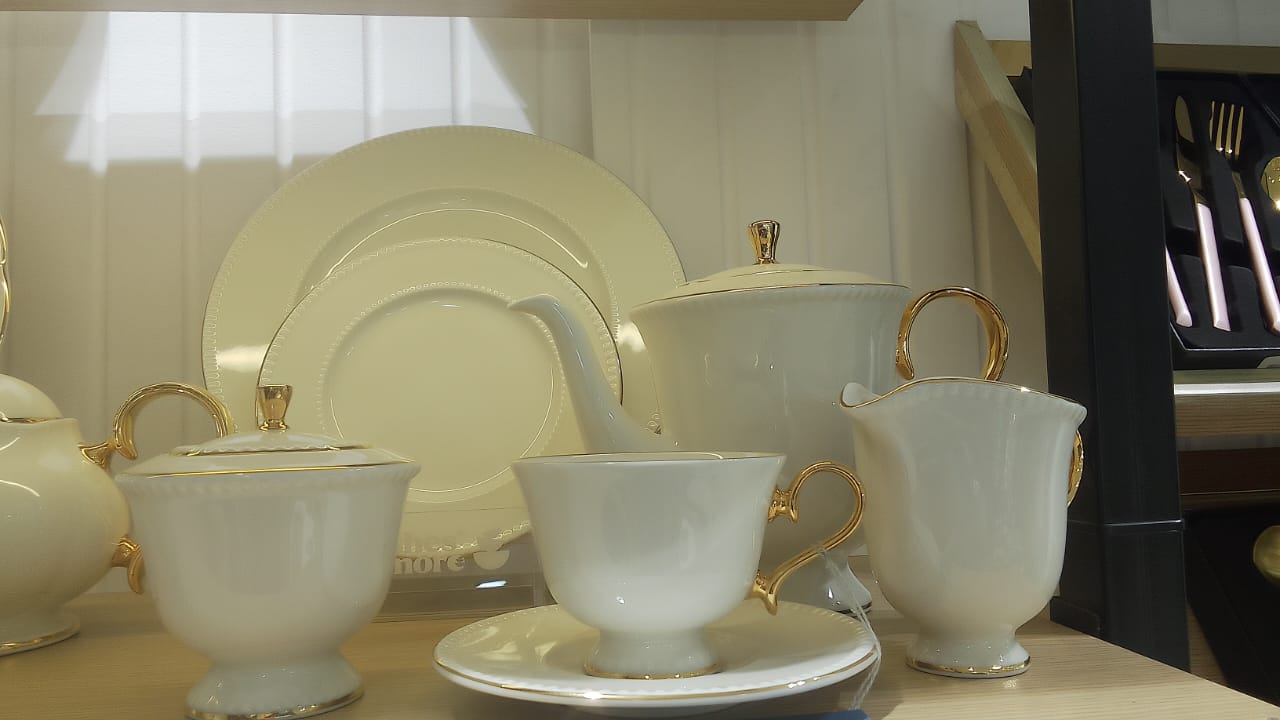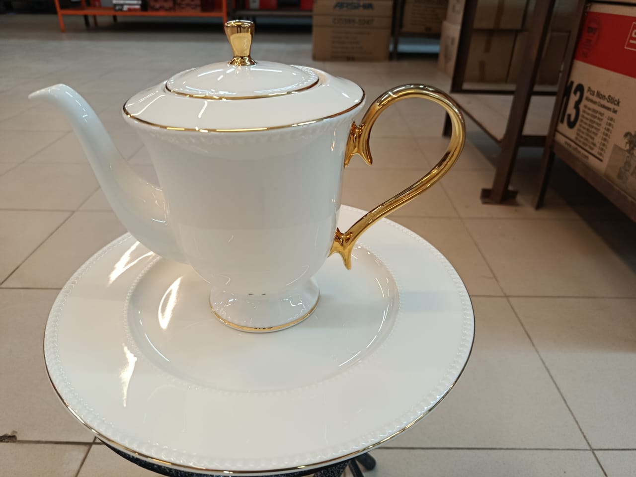 Tea and cake set, 24 pieces, Thai made, Elegant brand, soft light beige with golden touches on edges and handles.