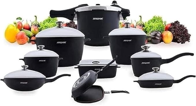 Tefal Arsha Cookware Set – German Made – 18 Pieces – Includes pots with lids (20, 24, 28 cm), a 22 cm pressure cooker, a 33 cm tagine with lid, an 18 cm casserole with lid, a 32 cm wok with lid, a 28 cm frying pan, and a 32 cm double grill pan.