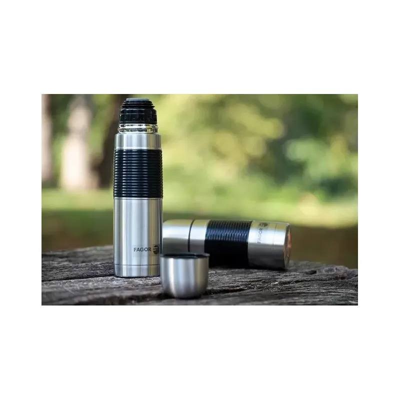 fagor Thermal Mug 350 ml - Made of stainless steel with double insulated walls to keep liquids hot for a long time, lid with dosing button to prevent spills, comfortable non-slip rubber grip, Spanish