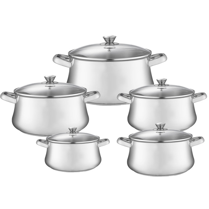 10‑piece stainless steel set with glass lids (pots 16‑20‑22‑26‑32)