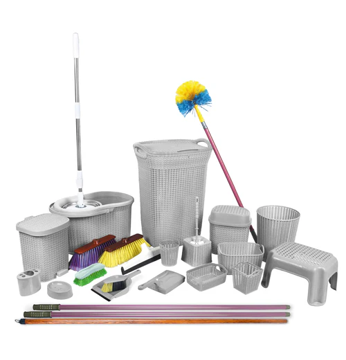 The Palm Home set of 25 includes a Palm Laundry Basket, Oval Laundry Basket, Small Trash Bin, Swing Trash Bin, Palm Bin, Palm Toilet Brush, Small Bread Basket, Multi Purpose Basket, Round Mix Basket, Square Mix Basket, Swivel-Sweeper with 3Rolls, Floor Capet Brush, Round duster with telescopic handle, Palm Bucket with Mop and handle, Squeegee with wooden handle, Soft Helen Brush with metal handle, Hard Helen Brush with metal handle, Dustpan with Brush Bathroom chair, Soap Tray and a Tooth Brush Holder. Everything your home needs to be clean and organised.