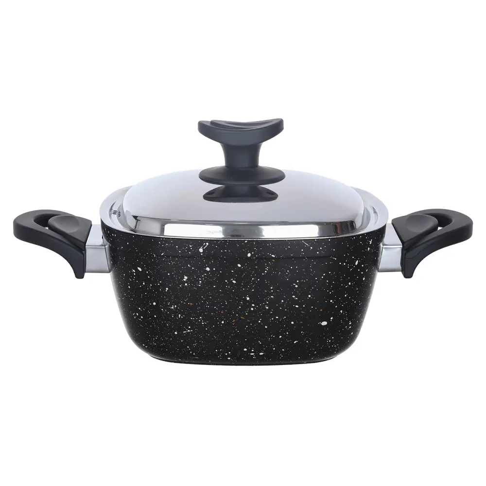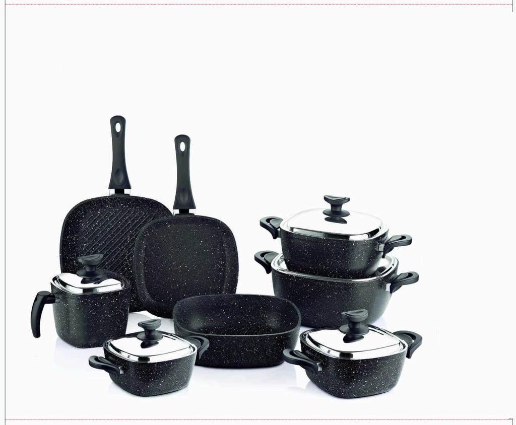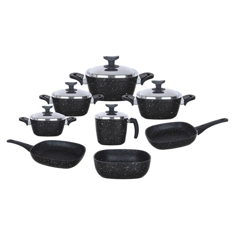 Saflon Granite Square Pot Set 13 Pieces, consisting of 4 Pots (18-20-24-28), a 16 cm Saucepan, a 24 cm Frying Pan, a 28 cm Grill, and a 26 cm Baking Tray