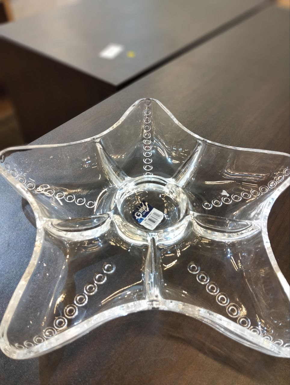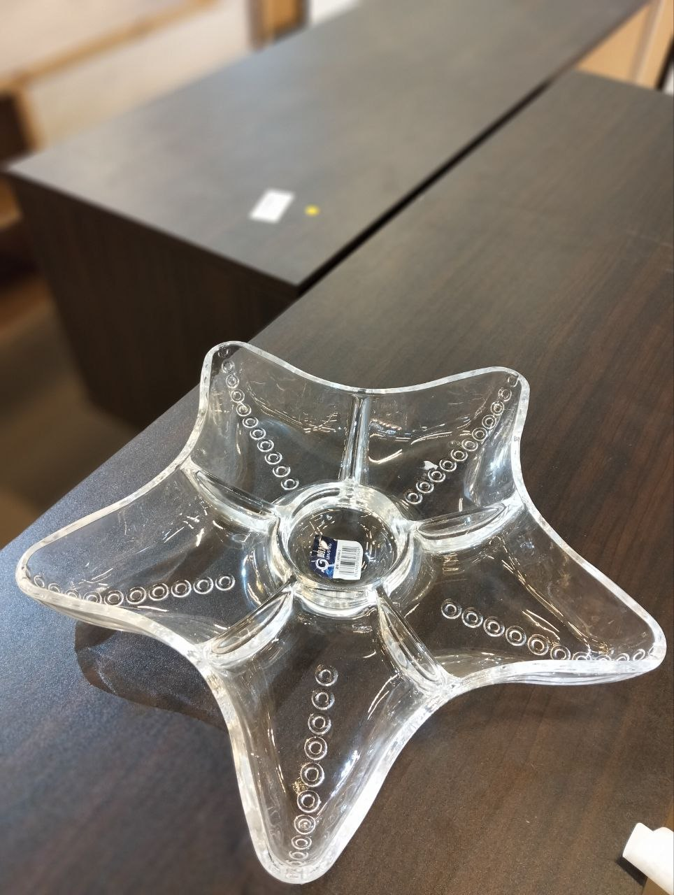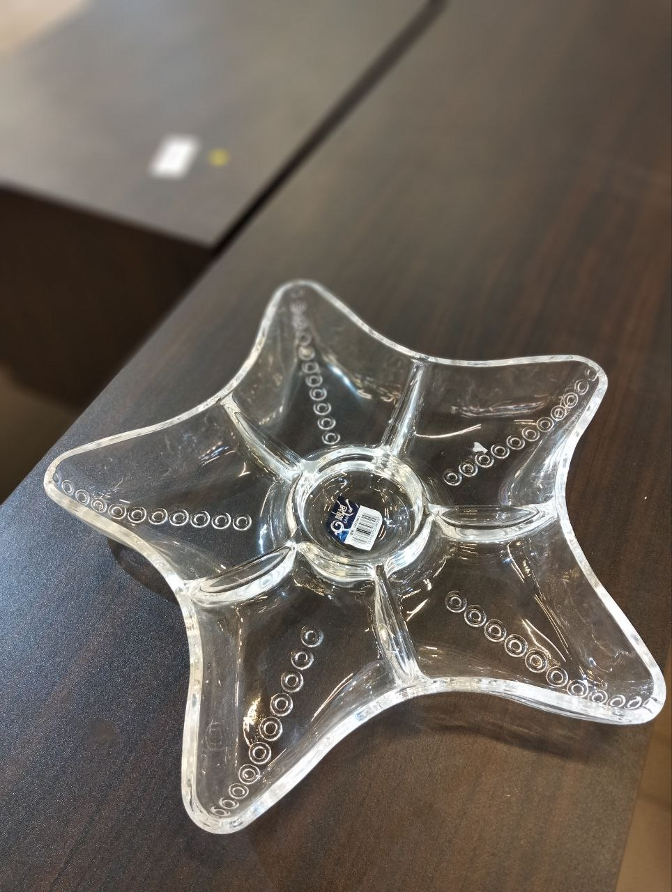 Living Home Glass Fruit Plate – Transparent design shaped like a five-pointed star, divided into several sections for serving nuts, fruits, or appetizers in an elegant and organized way. Features embo