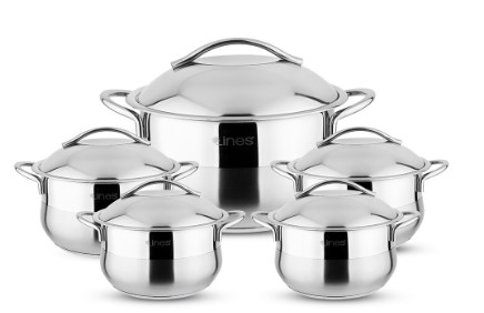 Turkish stainless steel cookware set, 10 pieces, composition (18-20-22-24-28), bombé shape with silver lines