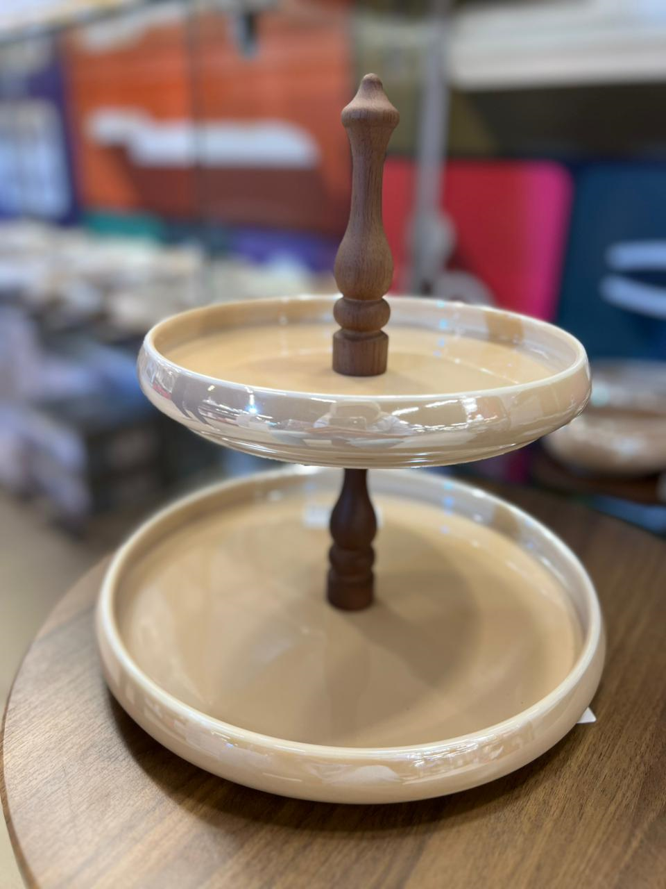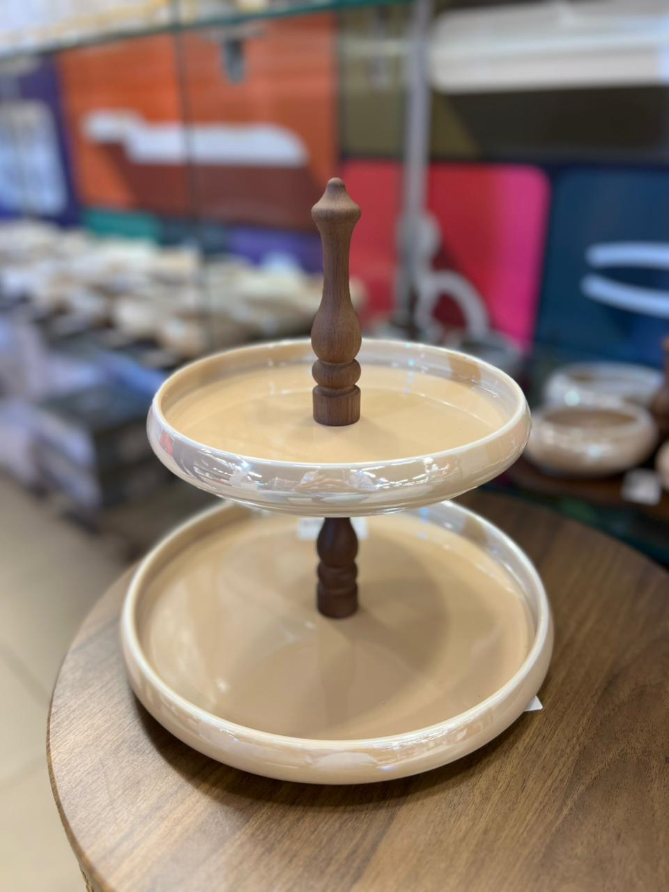 Two-Tier Porcelain Dessert Stand with Wooden Holder, featuring an elegant design with two layers and a sturdy central stand.