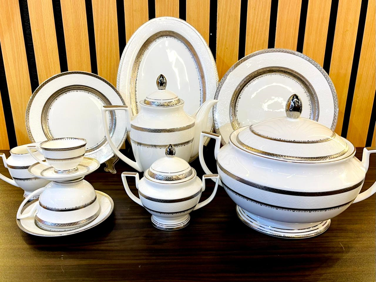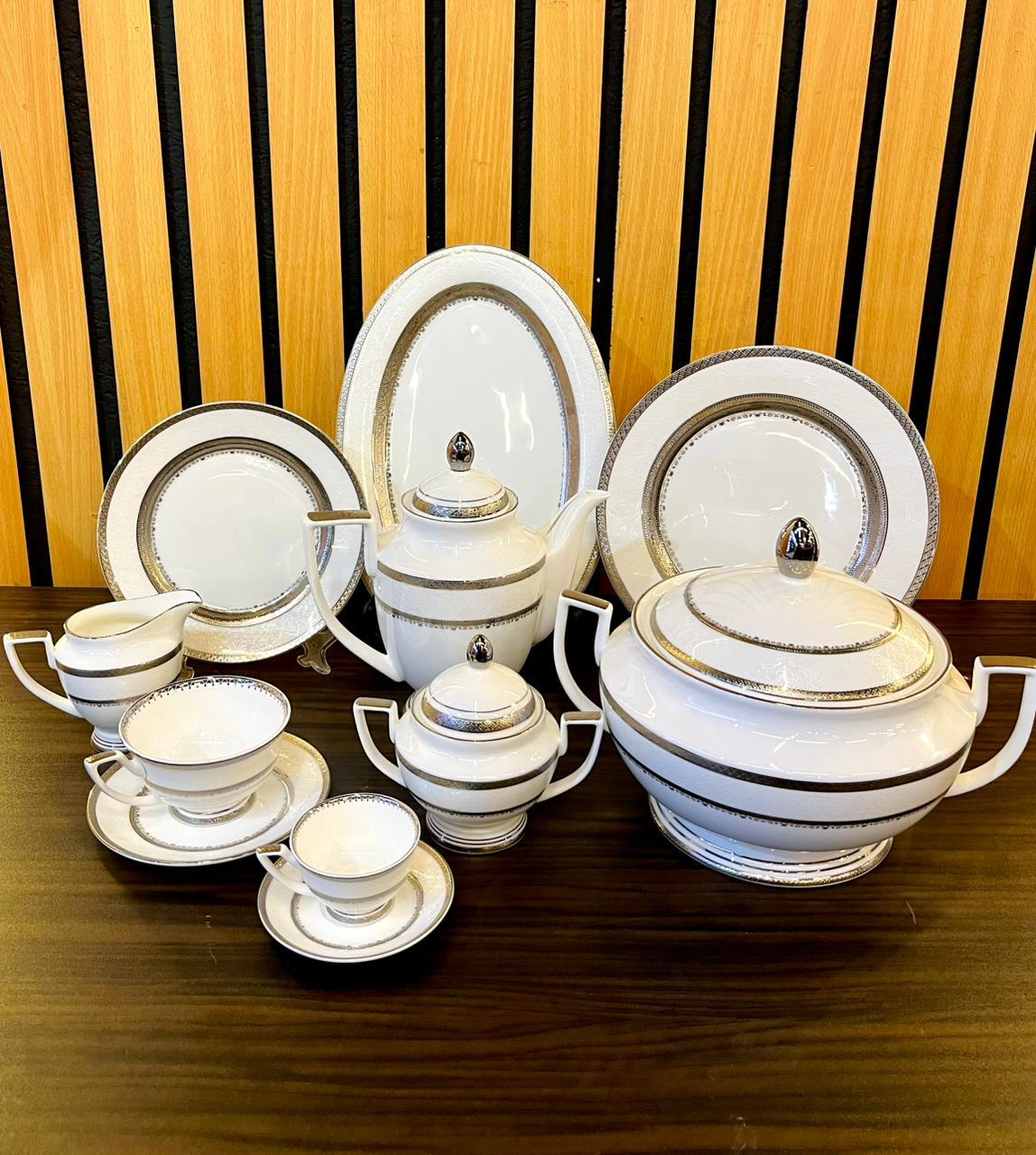 Weimar 111-Piece Dinner Set, high-quality porcelain distinguished by a wide, glossy gold rim decorated with precisely engraved floral motifs.