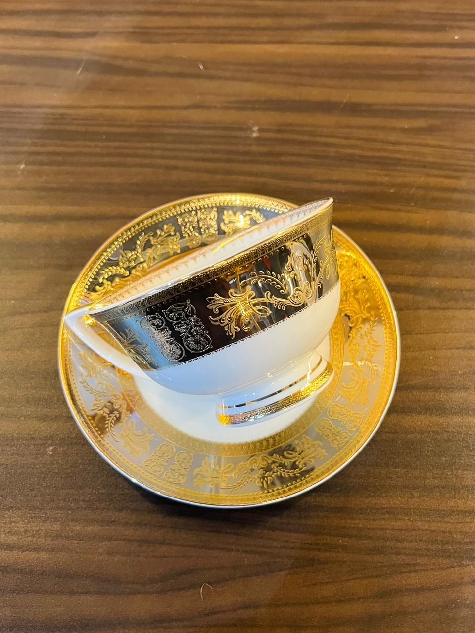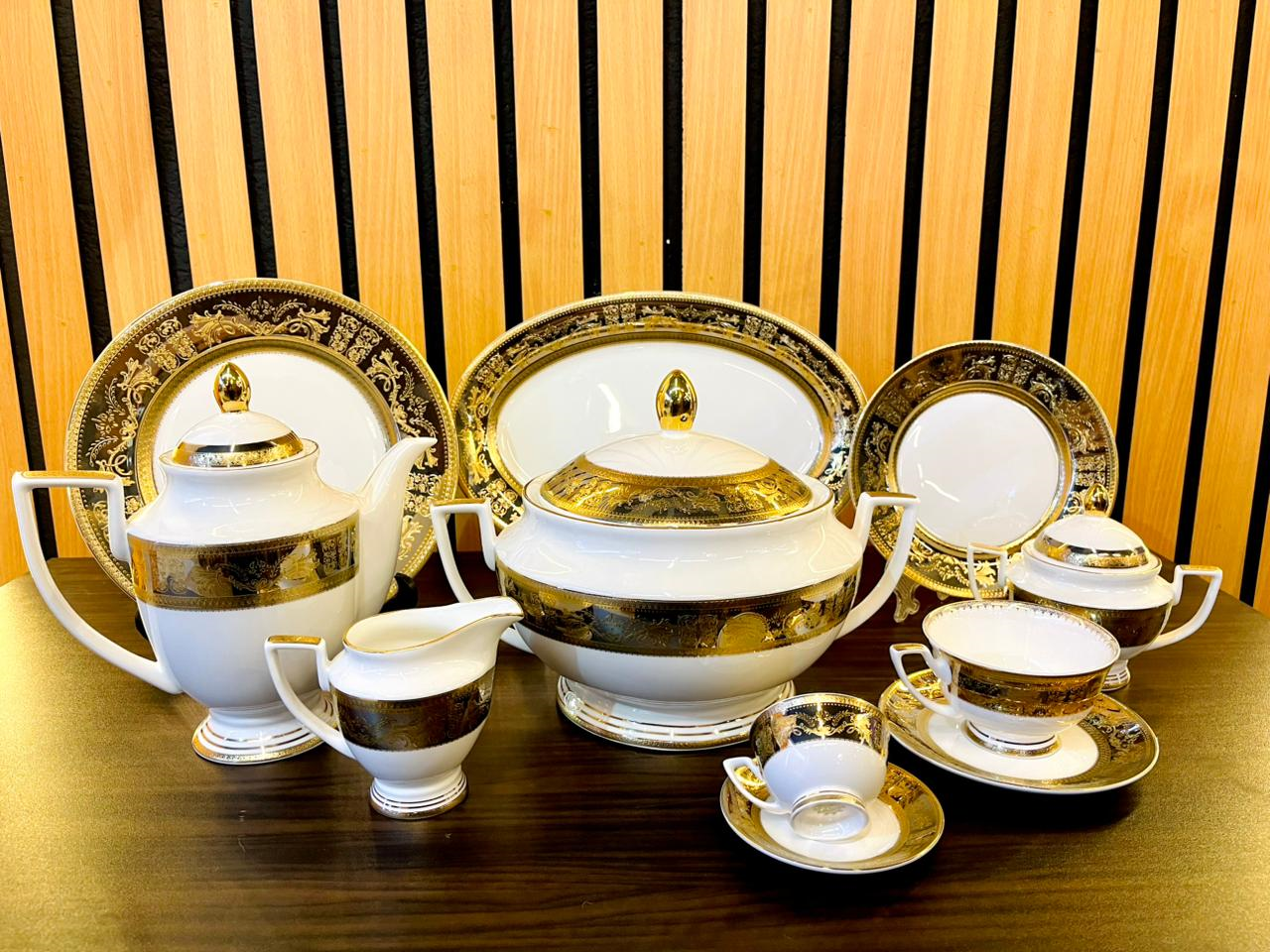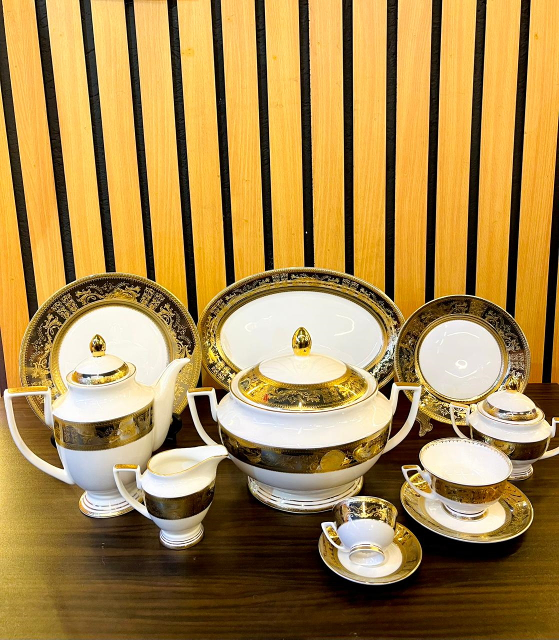 Weimar 111-Piece Dinner Set, high-quality porcelain with luxurious patterns inspired by the European style, composed of interwoven floral gold decorations.