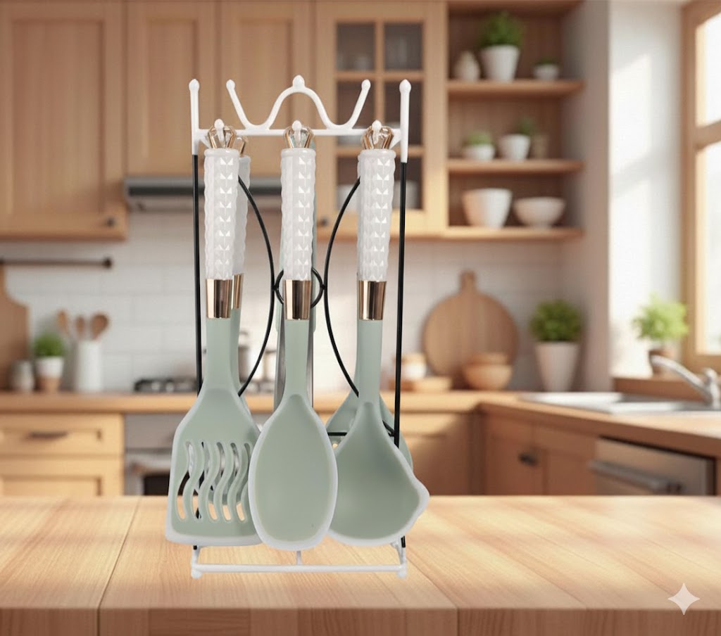 Wooden serving set 7 pieces with heat-resistant stand with comfortable and elegant handles