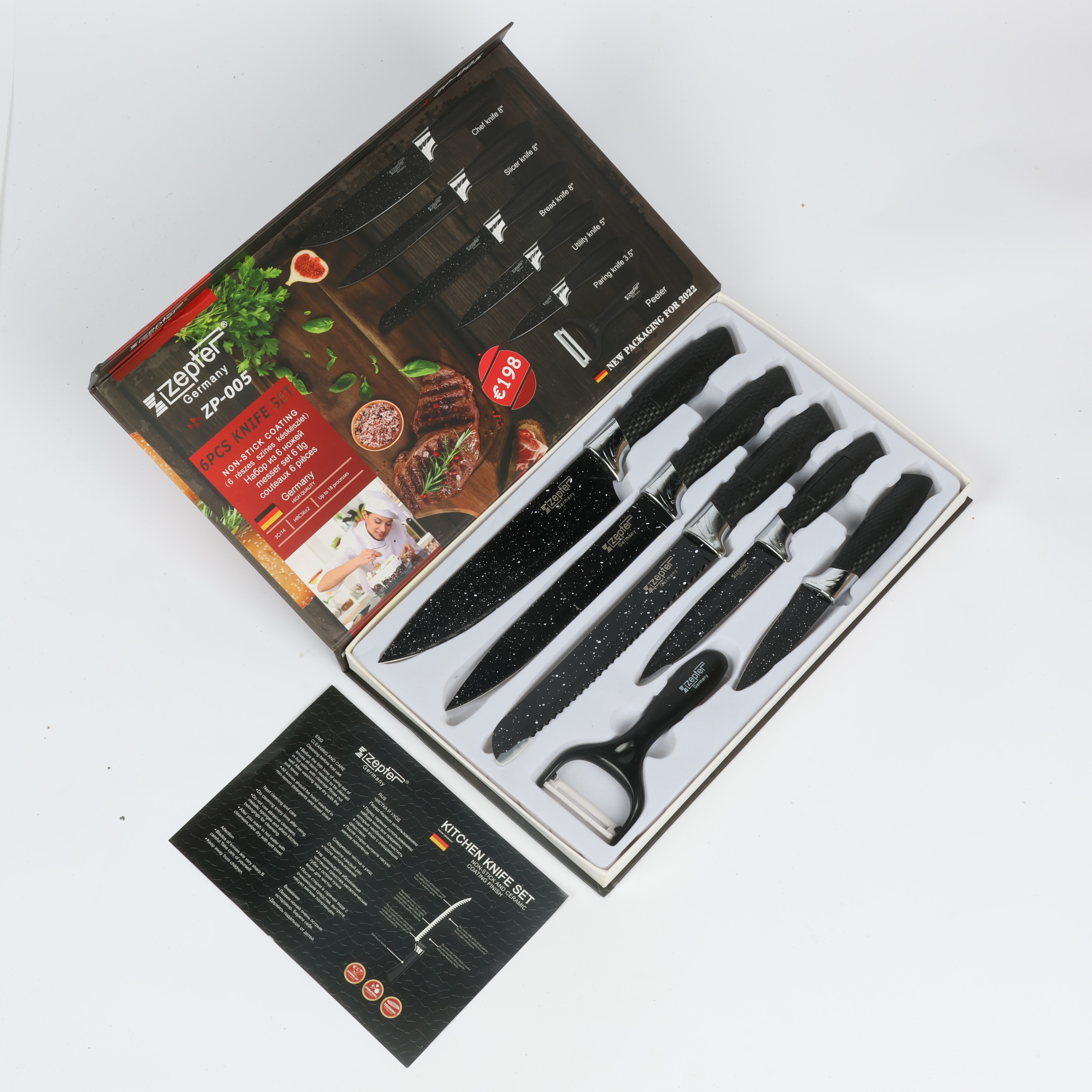 Zepter 6-piece knife set: 8" chef knife, 8" slicer knife, 8" bread knife, 5" utility knife, 3.5" paring knife, and peeler, black color.