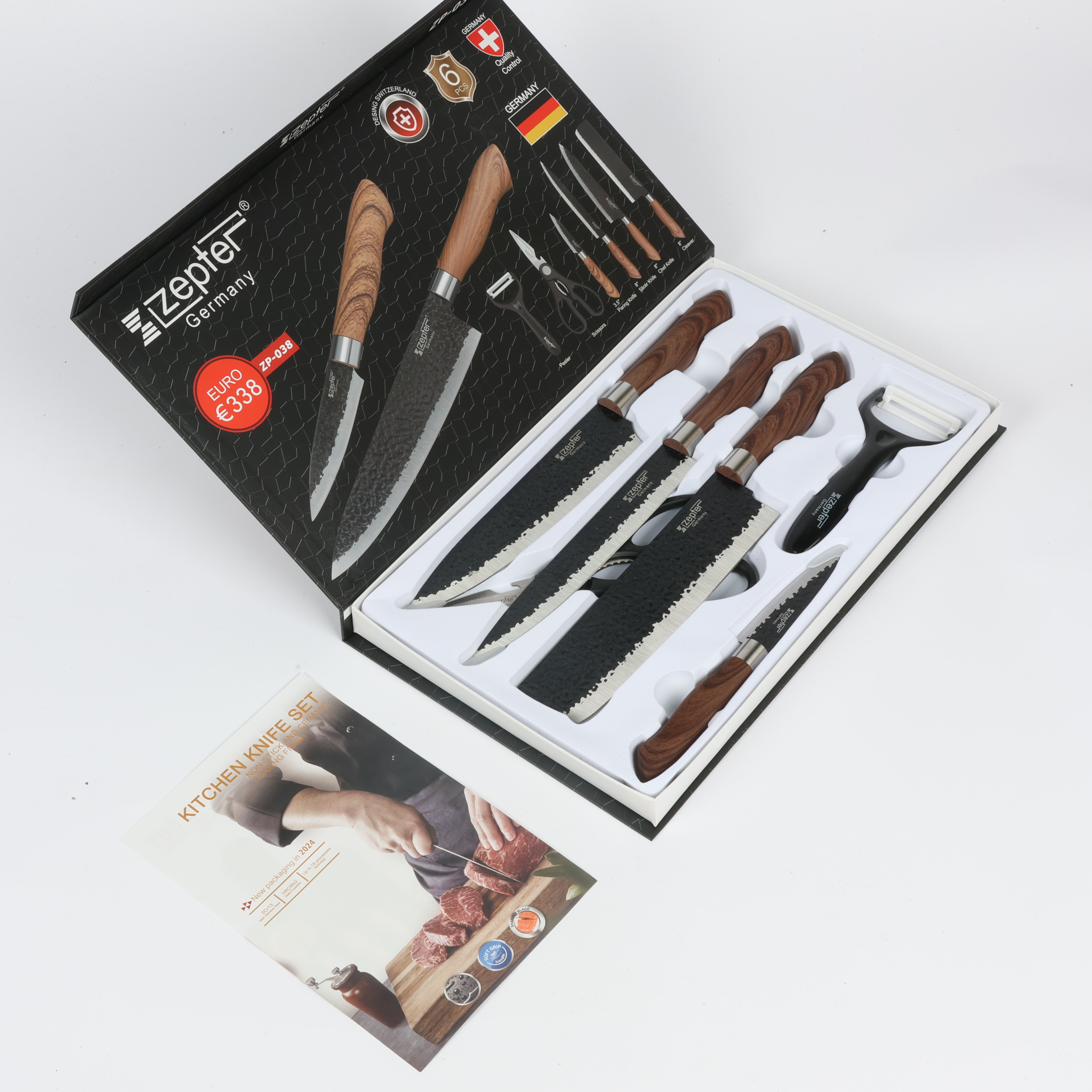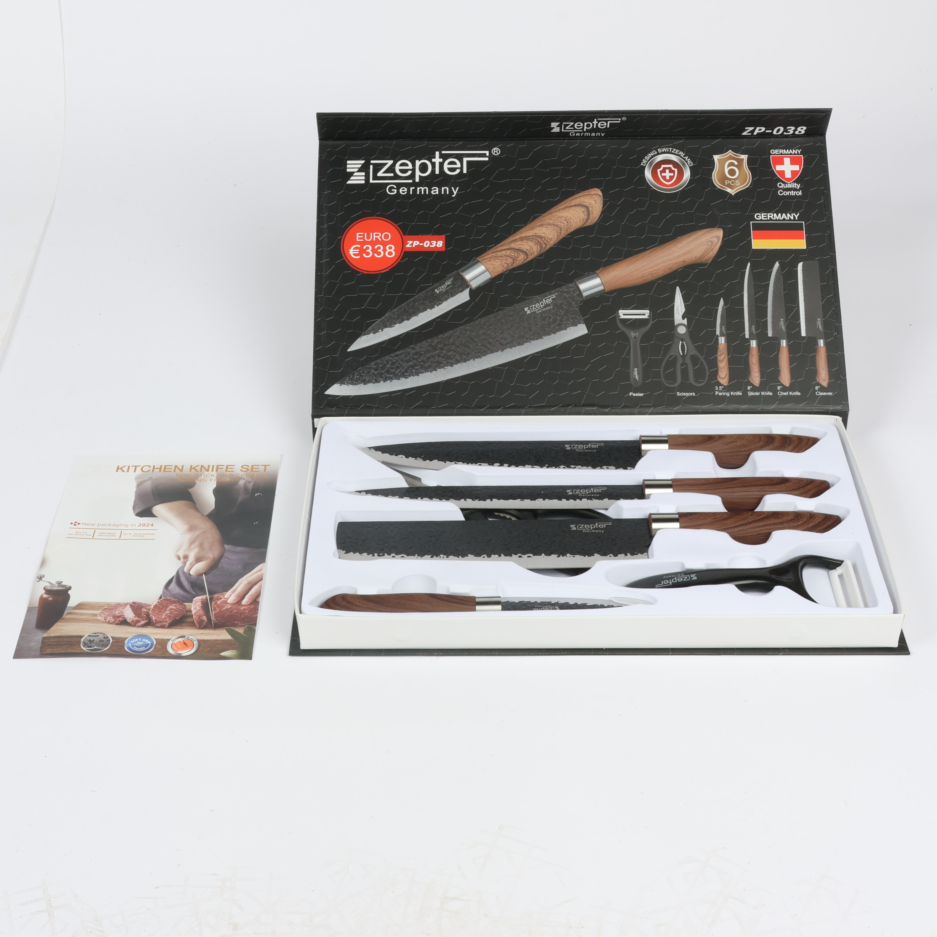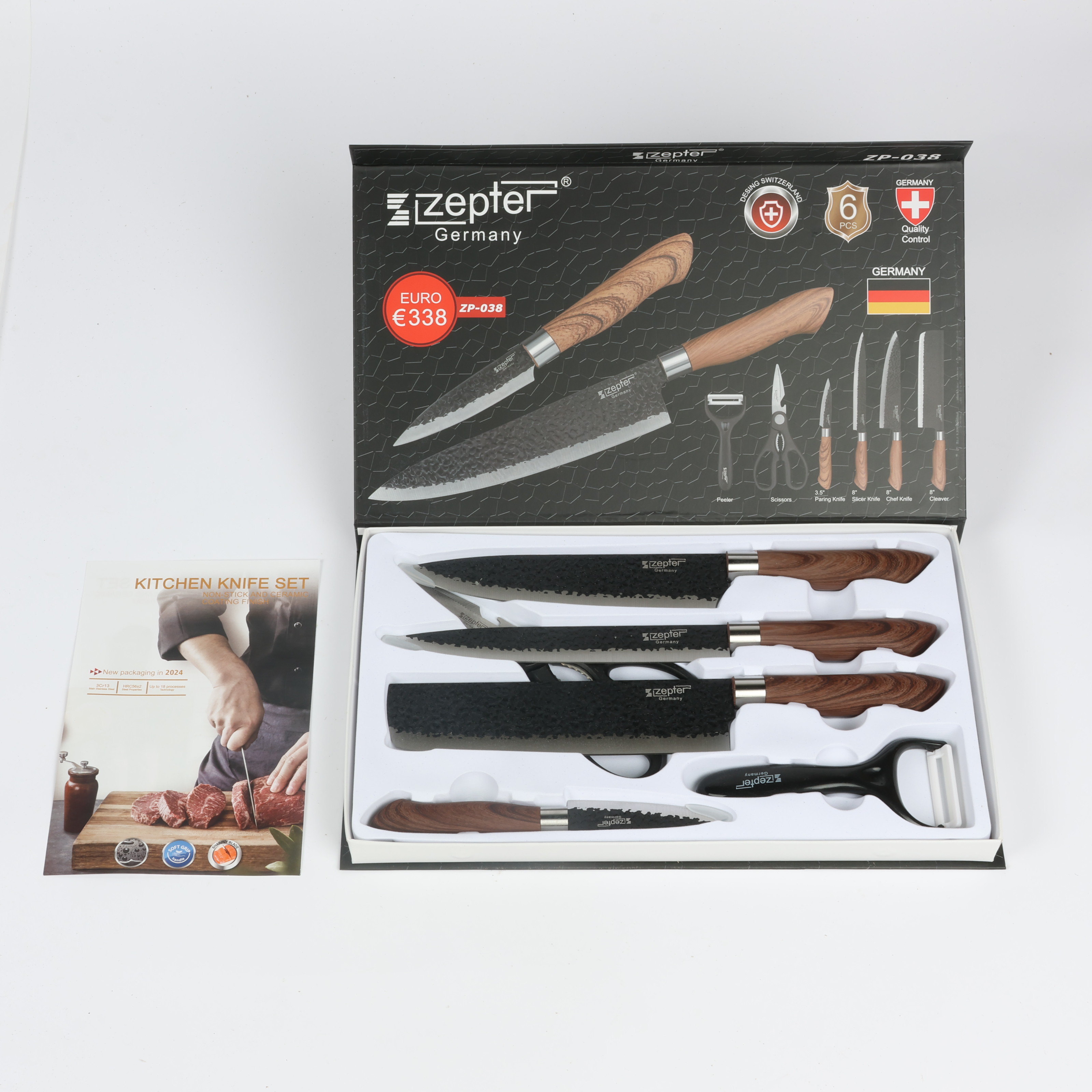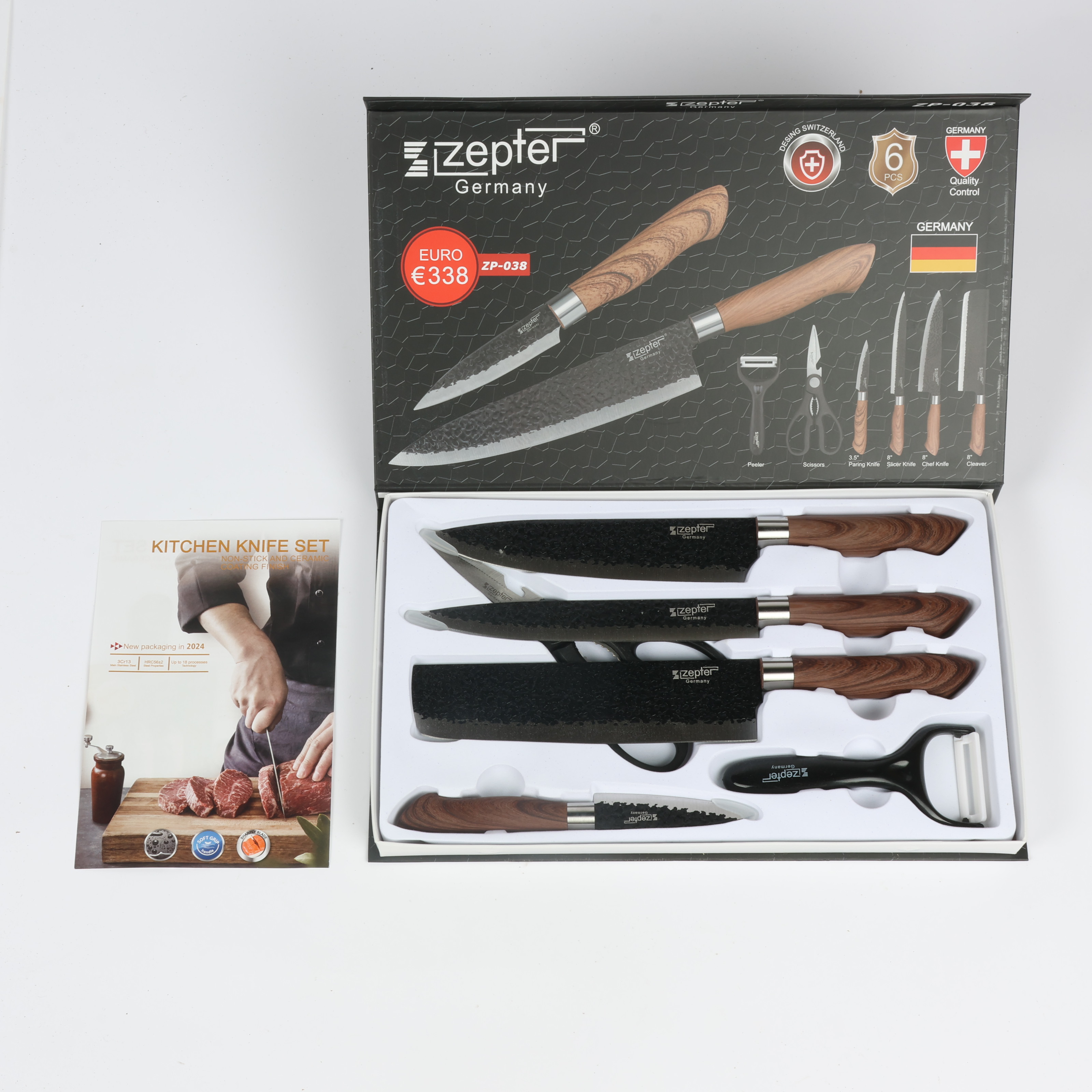 Zepter 6-Piece Knife Set: includes an 8-inch kitchen knife, 8-inch chef knife, 8-inch slicer knife, 3.5-inch paring knife, kitchen scissors, and a vegetable peeler