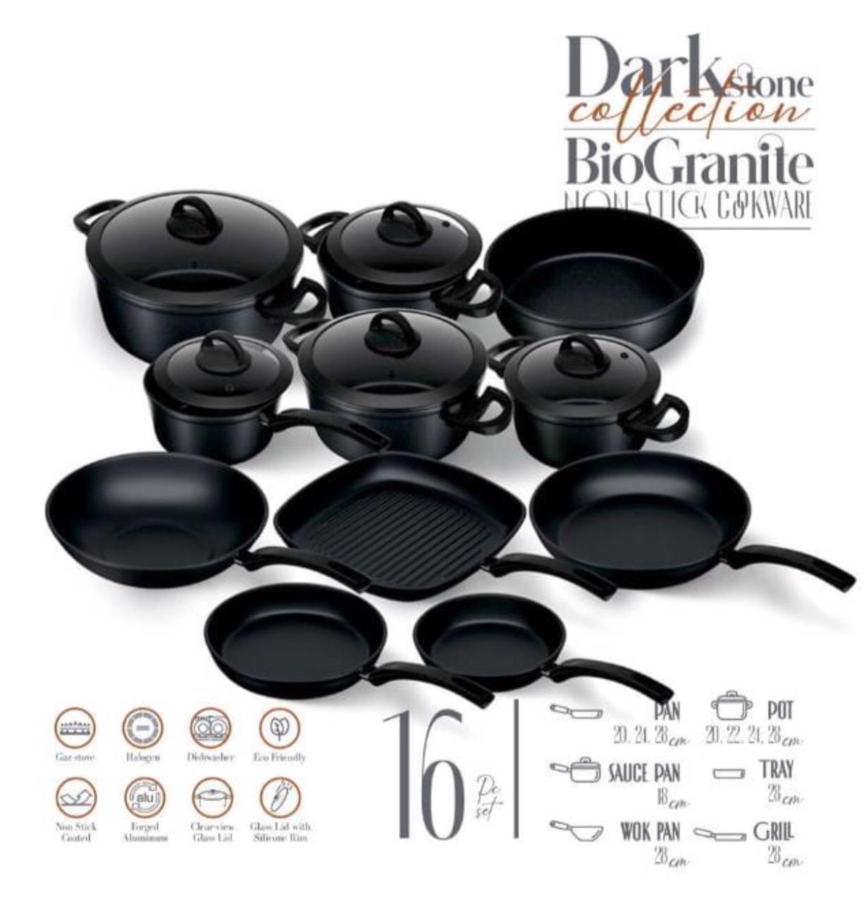 Aboud Bayo Granite 16-Piece Cooking Set (Pots 20/22/24/28 + Saucepan 18 cm + Frying Pans 20-24-28 + Wok 28 + Grill 28 + Baking Tray 28) Black