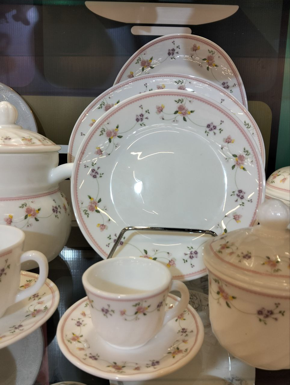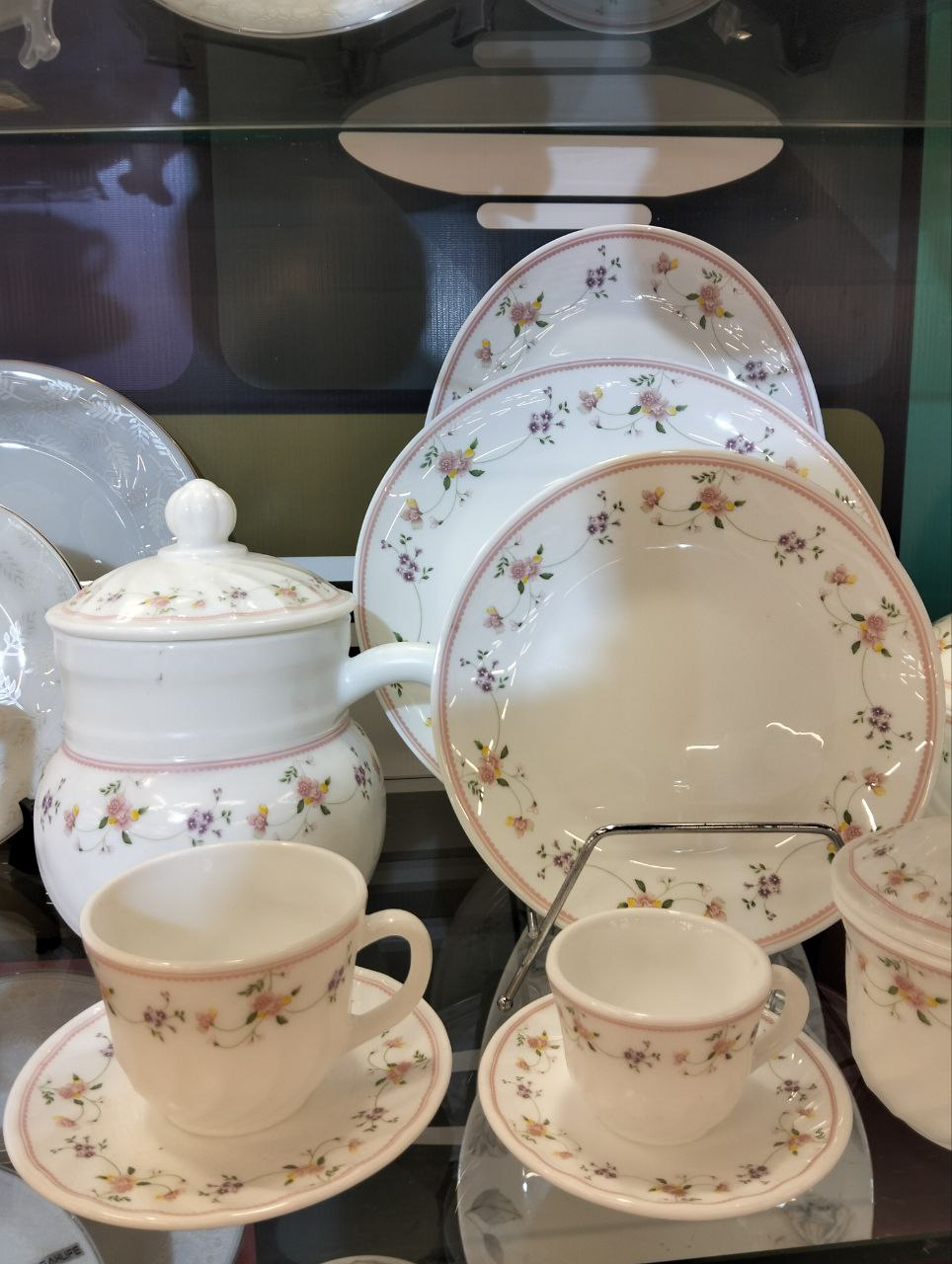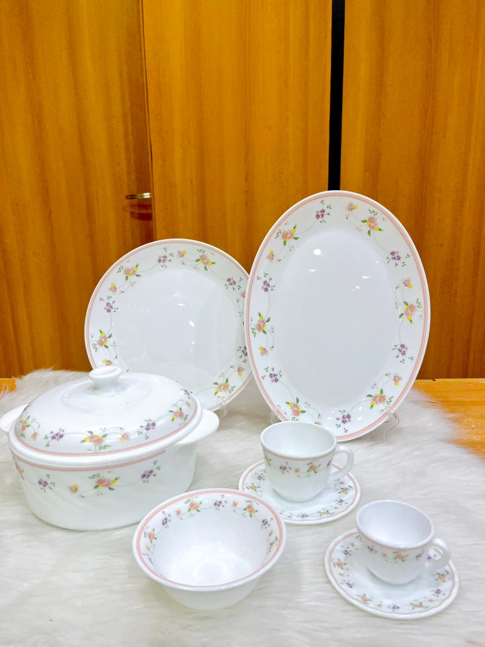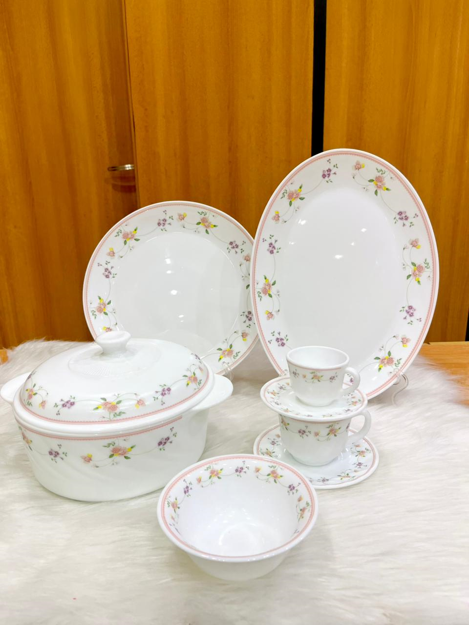 Arcopal set 60 pcs adorned with delicate floral patterns in pink and purple.