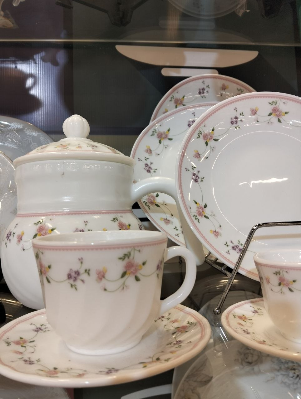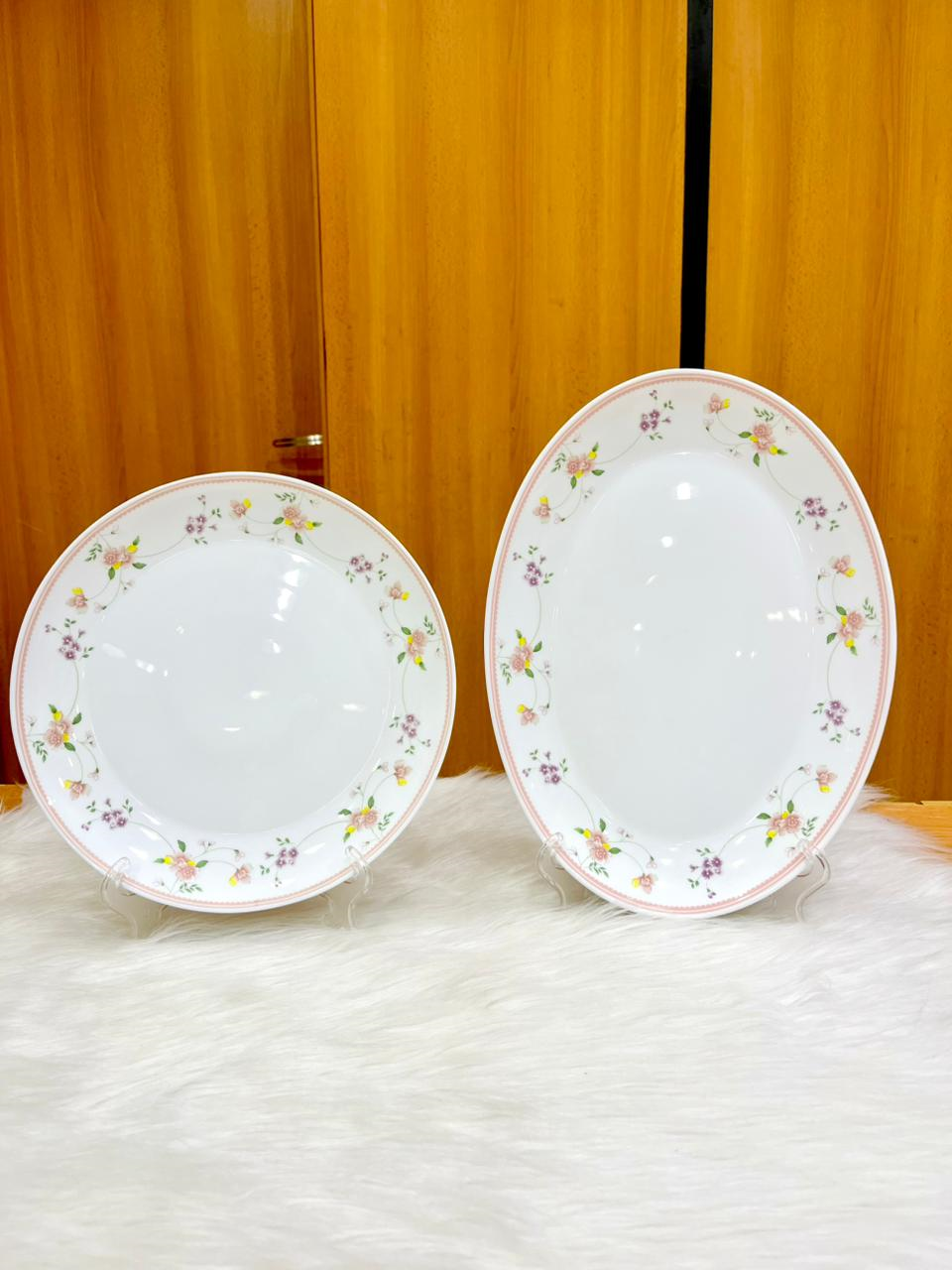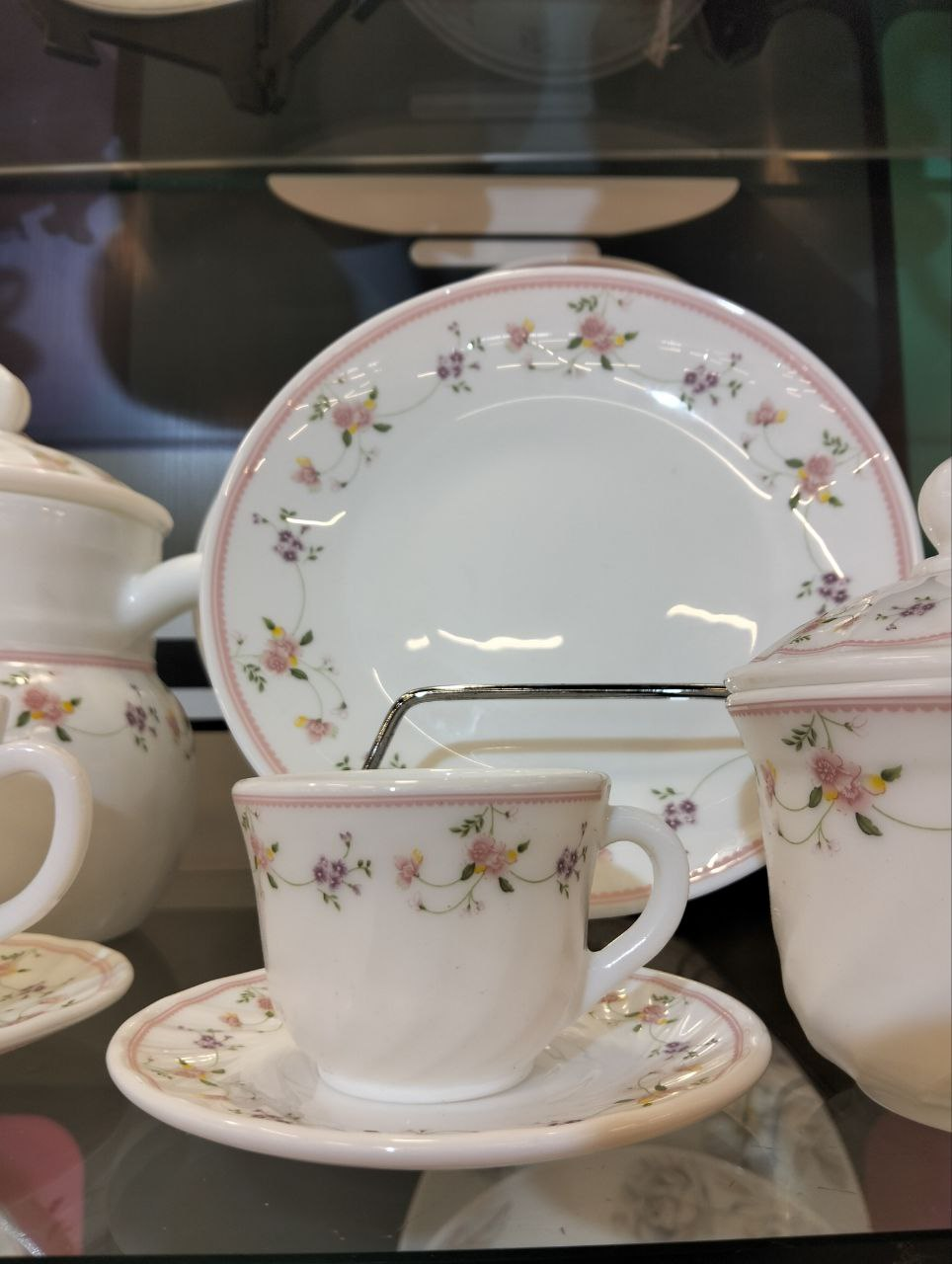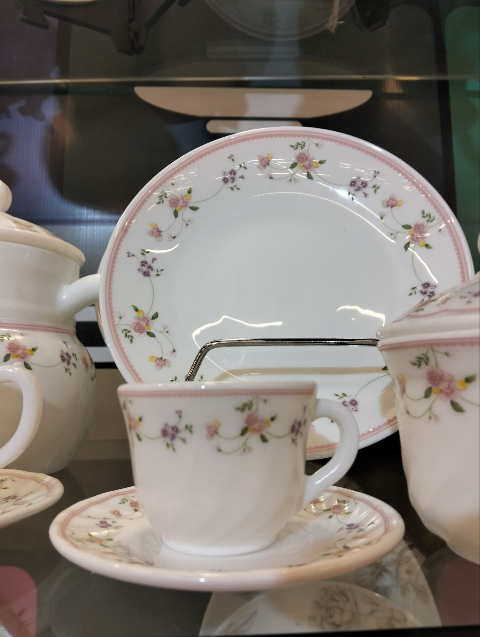 Arcopal set 60 pcs adorned with delicate floral patterns in pink and purple.
